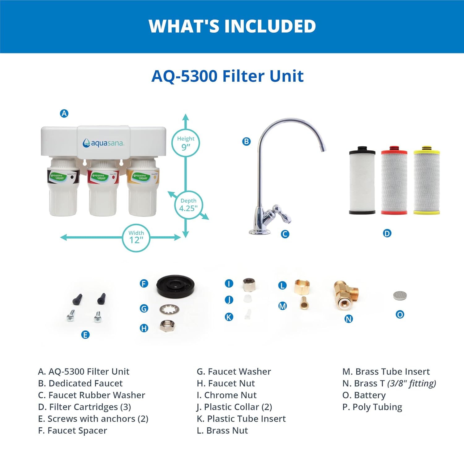 - Included Components filters, housing, faucet, install kit : Purification Method Activated Carbon