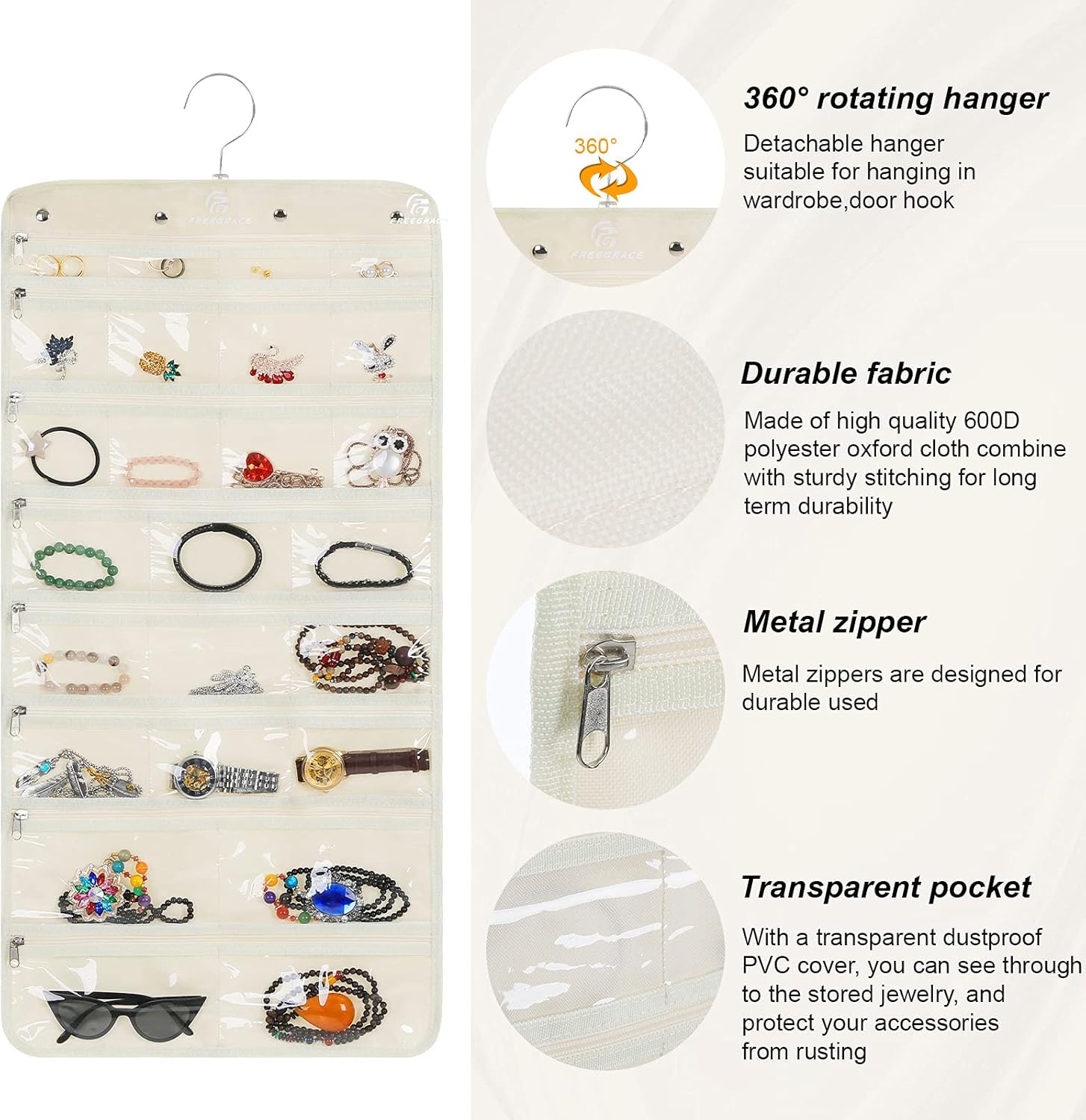 - QUALITY MATERIALS: Freegraceās sturdy hanging jewelry organizer is made of 600D polyester Oxford fabric and has a PU backing (SIZE: 32.7āā x 16.5āā). The pockets are made of transparent PVC to allow you to see through to the stored jewelry, and the zipper and revolving metal hanger are well-made and durable.