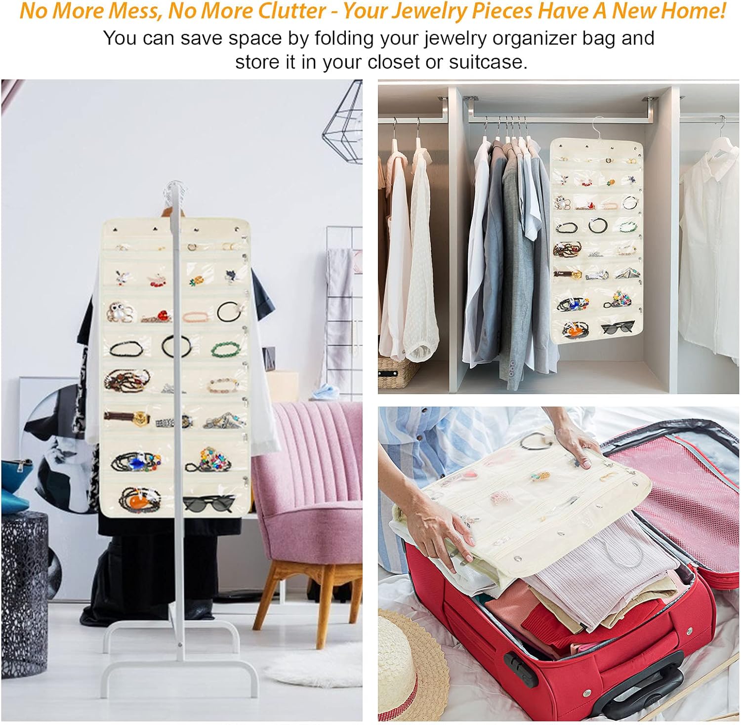 - 360 degree rotational hanger and Secure Zipper Closure, Never have to worry your jewelries ever fall down again and browse its pockets and loops easier than ever.