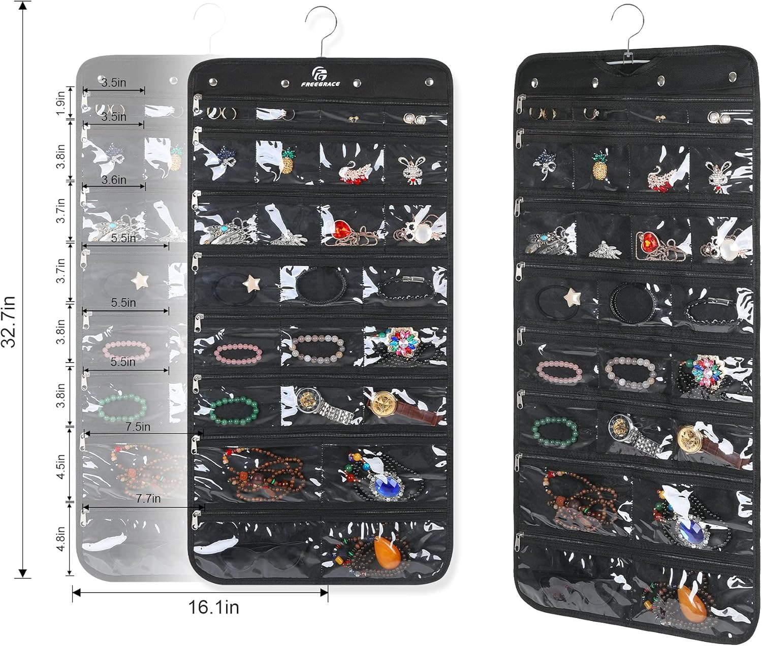 - QUALITY MATERIALS: Freegraceās sturdy hanging jewelry organizer is made of 600D polyester Oxford fabric and has a PU backing (SIZE: 32.7āā x 16.5āā). The pockets are made of transparent PVC to allow you to see through to the stored jewelry, and the zipper and revolving metal hanger are well-made and durable.
