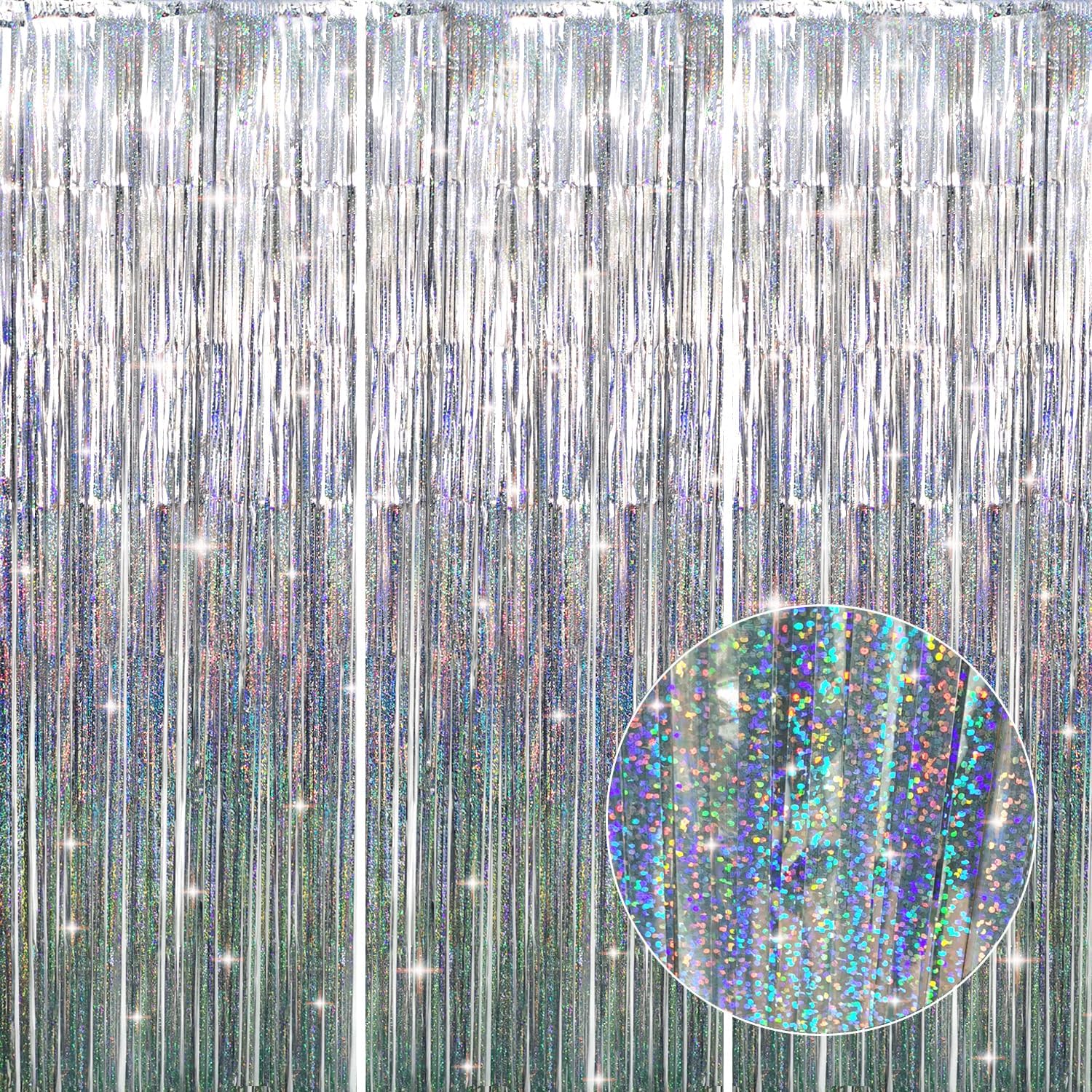 - Package Includes:3 pack shiny silver foil fringe curtains,3.2 ft x9.8 ft each,suitable for hanging on a door or coverage a wall fully