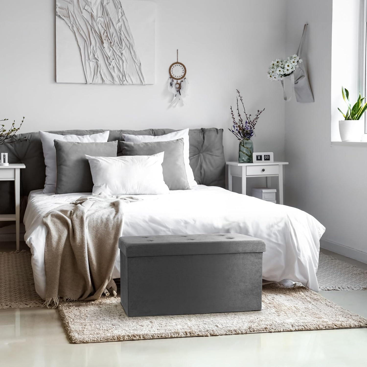 - SUEDE STORAGE BENCH/ OTTOMAN CHEST (GRAY) — Add storage and seating with a beautiful rectangular shaped folding bench, perfect for storing a variety of items— Tuck away linens, games, books, blankets, accessories, and more to maximize your space with contemporary style