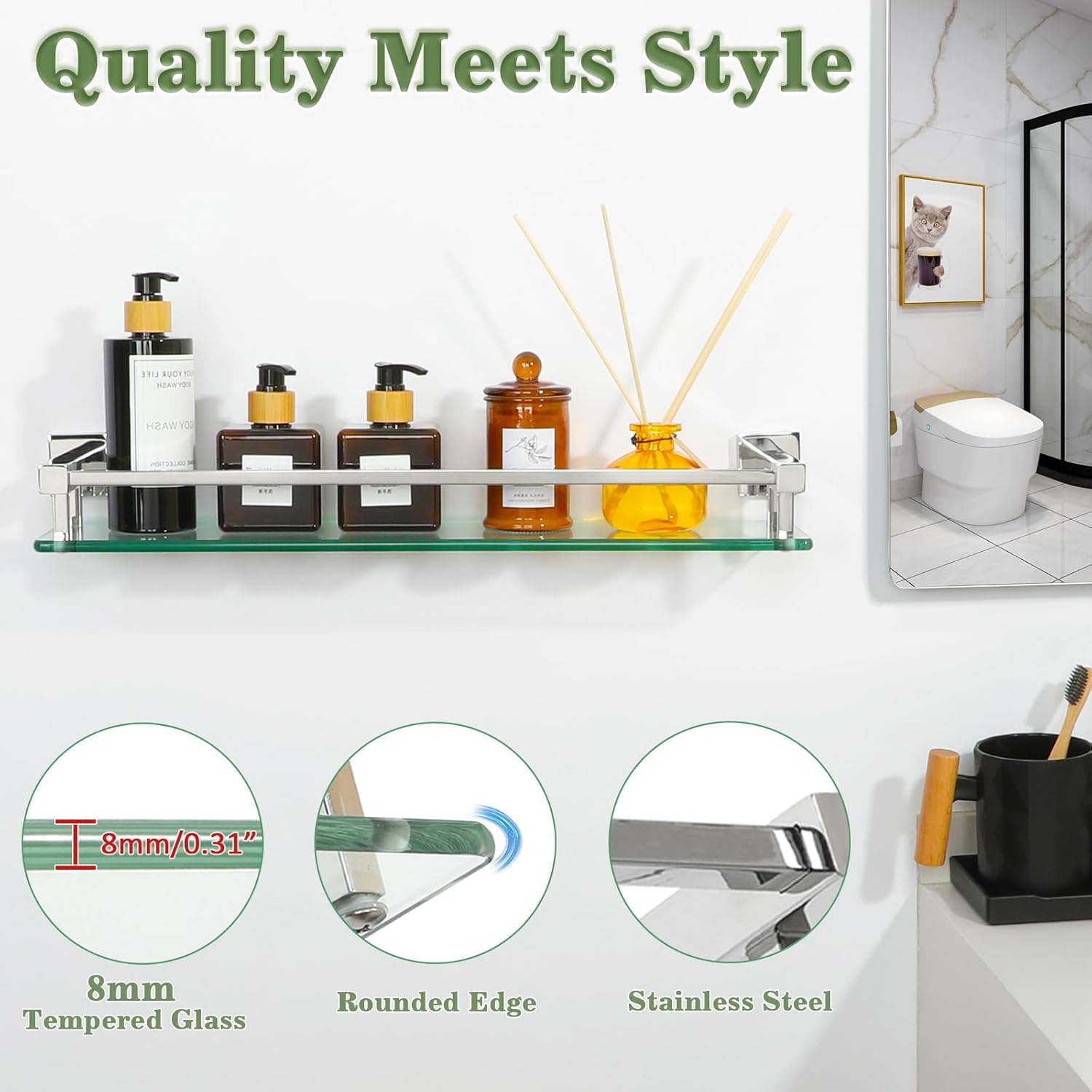 - CLEAR VIEW:The transparent glass of our floating shelves for bathroom allows you to showcase your items while keeping your space looking uncluttered and open