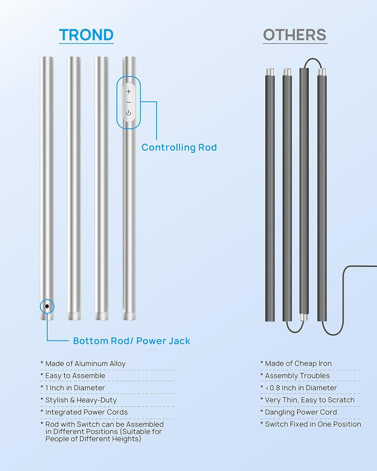 - Modern Floor Lamp: This floor lamp innovatively features 4 detachable modular aluminum rods, all of which have the integrated power cords built inside. This design gives you the convenience and flexibility to assemble, disassemble and adjust the height. The tall floor lamp total height is 180 cm/71 in, taller than other similar lamps, so that you wonāt stare directly at the bright light