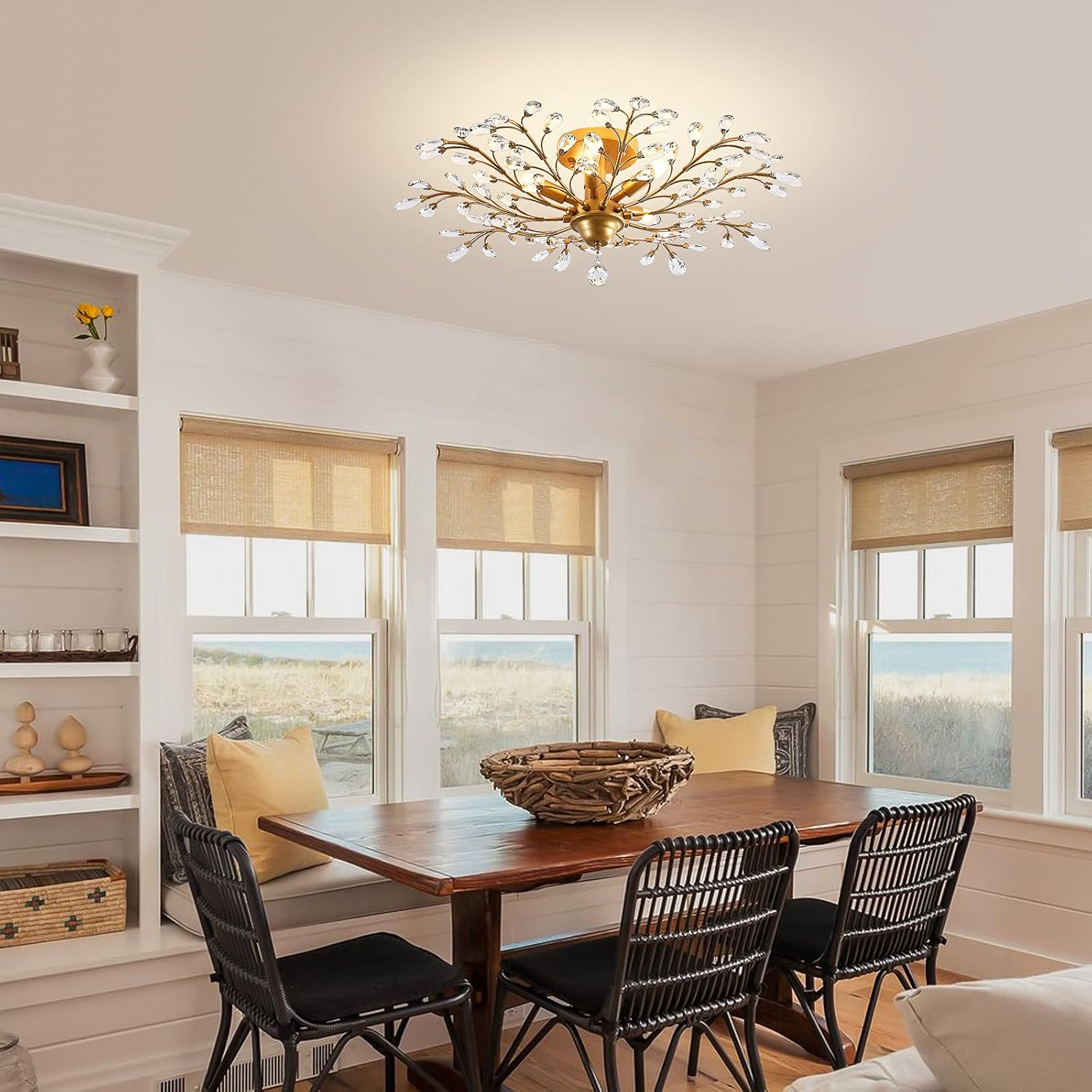 - CLASSIC DESIGN: This gold ceiling light is beautifully decorated.Use transparent glass crystals to capture and reflect the light of the bulb,sparkling and shiny light effect to created a warm and soft atmosphere.
