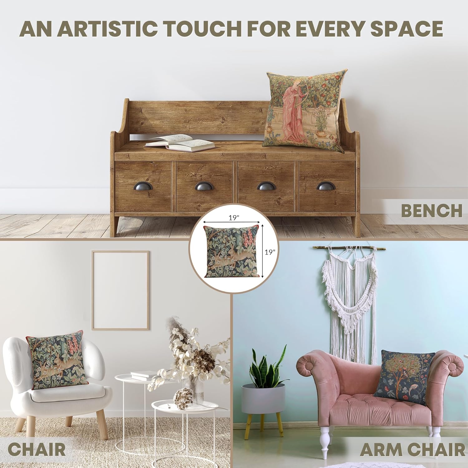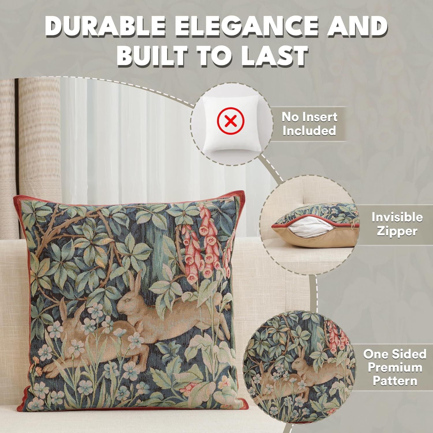 - Timeless Durability: Elevate your decor with our skin-friendly William Morris pillow covers 19”X19”, where quality and style come together. A sturdy hidden zipper ensures easy pillow insertion/removal, while the overlock stitches prevent seam ripping. Unlike thin printed cushion covers prone to tearing, our decorative pillows for couch with a super-soft backside are crafted with thick premium threads for long-lasting quality. THE PACKAGE INCLUDES A SINGLE TAPESTRY PILLOW COVER WITHOUT AN INSERT
