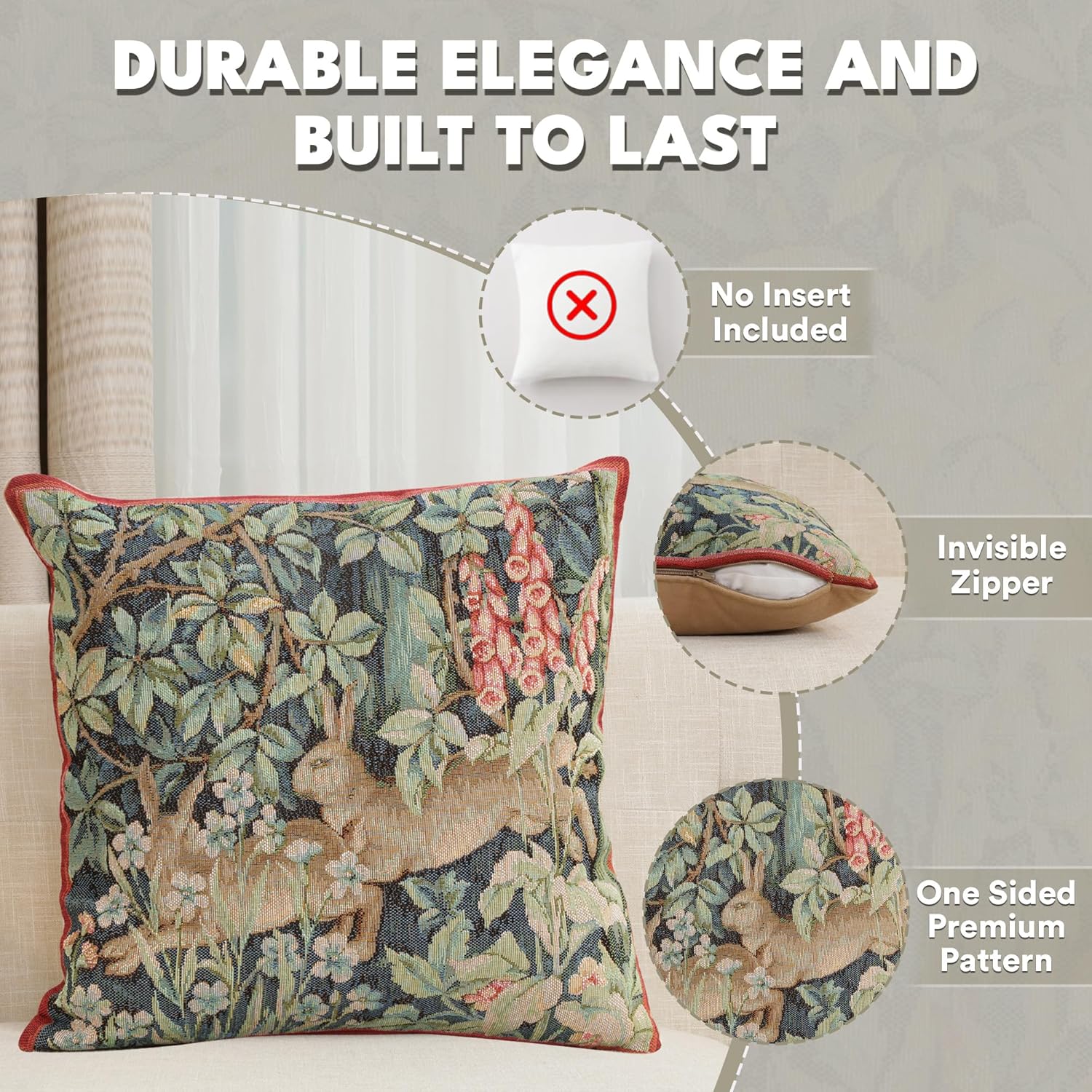 - Timeless Durability: Elevate your decor with our skin-friendly William Morris pillow covers 14”X14”, where quality and style come together. A sturdy hidden zipper ensures easy pillow insertion/removal, while the overlock stitches prevent seam ripping. Unlike thin printed cushion covers prone to tearing, our decorative pillows for couch with a super-soft backside are crafted with thick premium threads for long-lasting quality. THE PACKAGE INCLUDES A SINGLE TAPESTRY PILLOW COVER WITHOUT AN INSERT