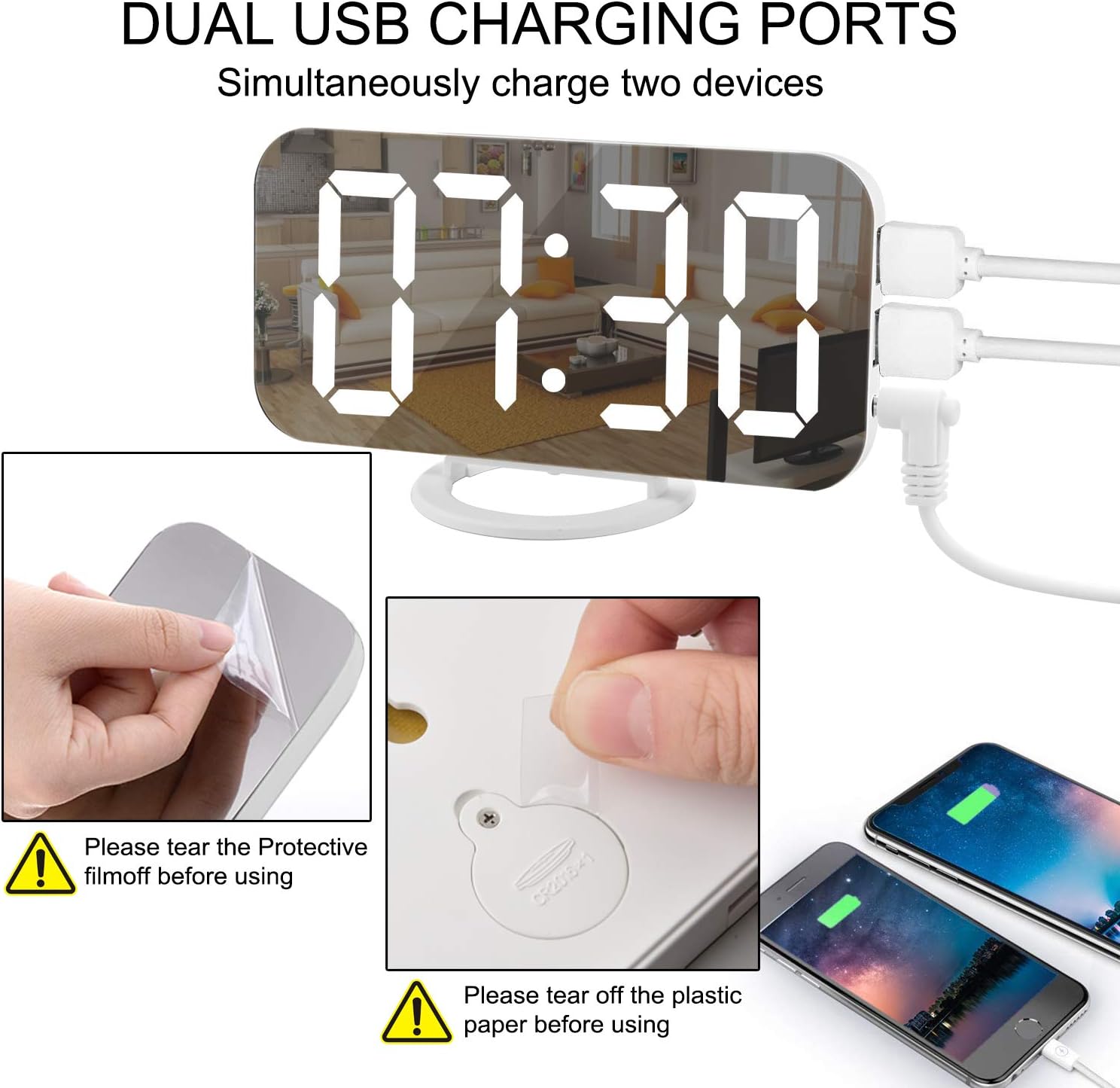 SZELAM Digital Clock Large Display, LED Electric Alarm Clocks Mirror Surface for Makeup with Diming Mode, 3 Levels Brightness, Dual USB Ports Modern Decoration for Home Bedroom Decor-White (001)