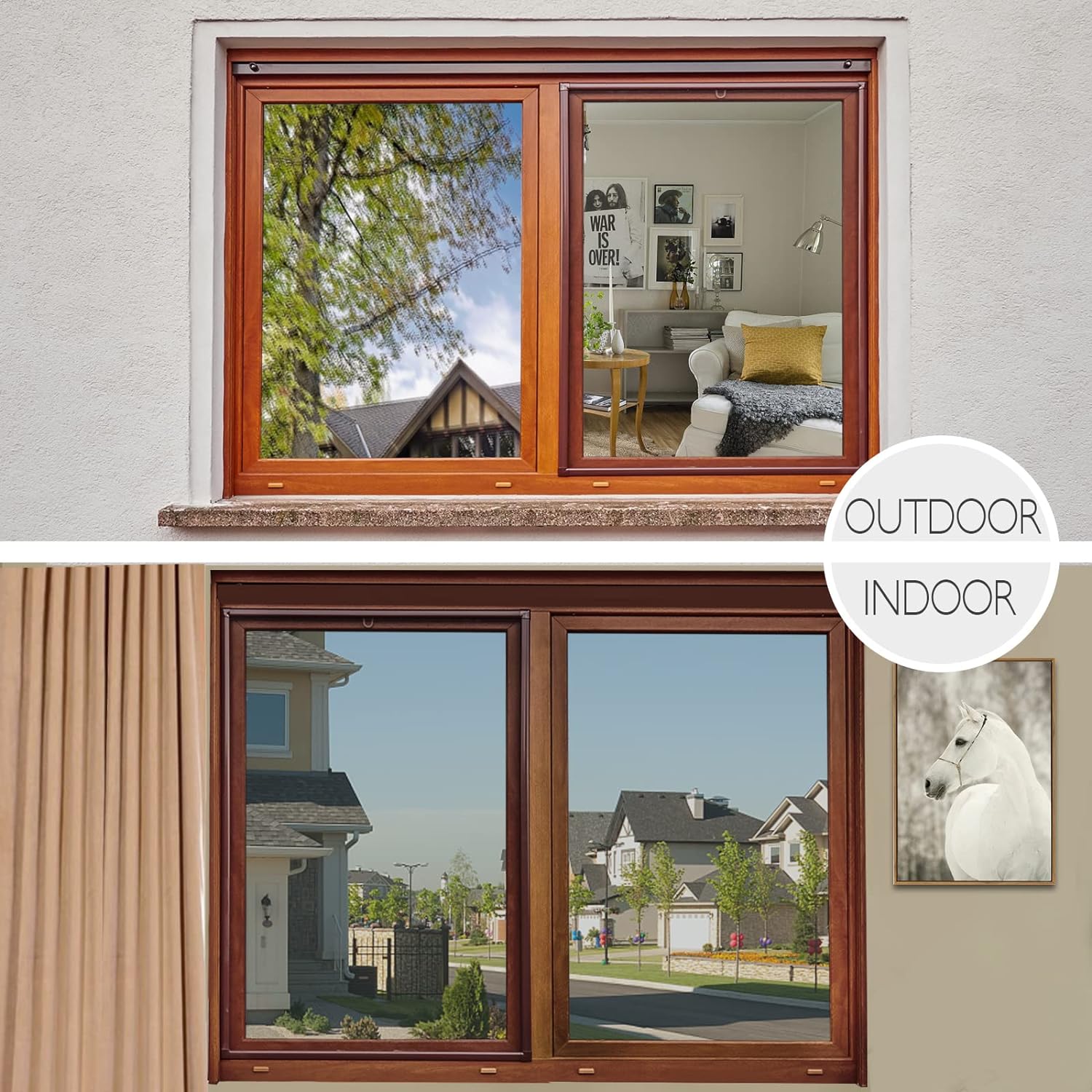 - DAYTIME PRIVACY PROTECTION – Applying our mirror window film to your windows keeps prying eyes from looking in during daytime while letting natural lights in, and outside glass shows a mirror reflective effect. NOTICE: When the inside light is stronger than outside at night, the film CANNOT provide privacy, and the mirror reflective effect will disappear. Do remember to draw the curtains during the night.