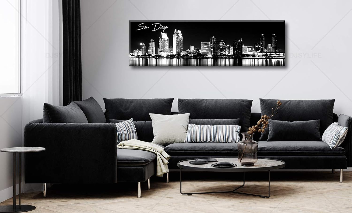 DJSYLIFE San Diego Skyline Wall Art Black and White Night View USA Cityscape California Pictures Artwork Painting Poster for Bedroom Office Decoration Stretch Framed Ready to Hang 13.8"x47.3"