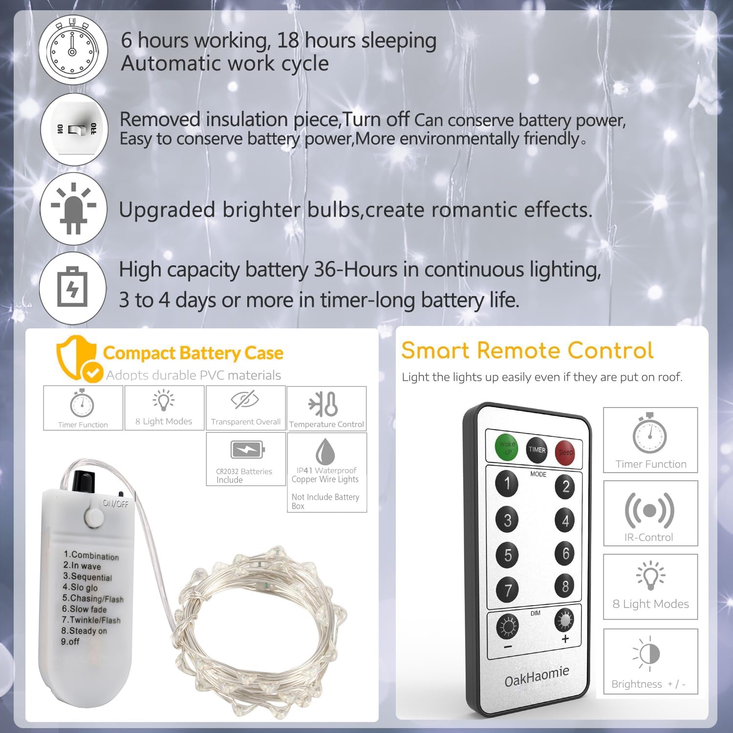 - ćRemote Control Fairy lightsć-OakHaomie fairy lights comes with 2pcs remote controllers.Except the basic remote switch function,it also can change lighting mode, brightness adjustment and timing functions. Press the timer button, the light off automatical after 6 hours, and switches it back on at the same time next day,In terms of brightness, The factory default brightness level is set to 50%,from soft to bright, the brightness can be adjusted ; 8 lighting modes lights is suitable for everyday decorations and holiday decorations, the soft lighting will add a delicate and setting off a warm and comfortable atmosphere..