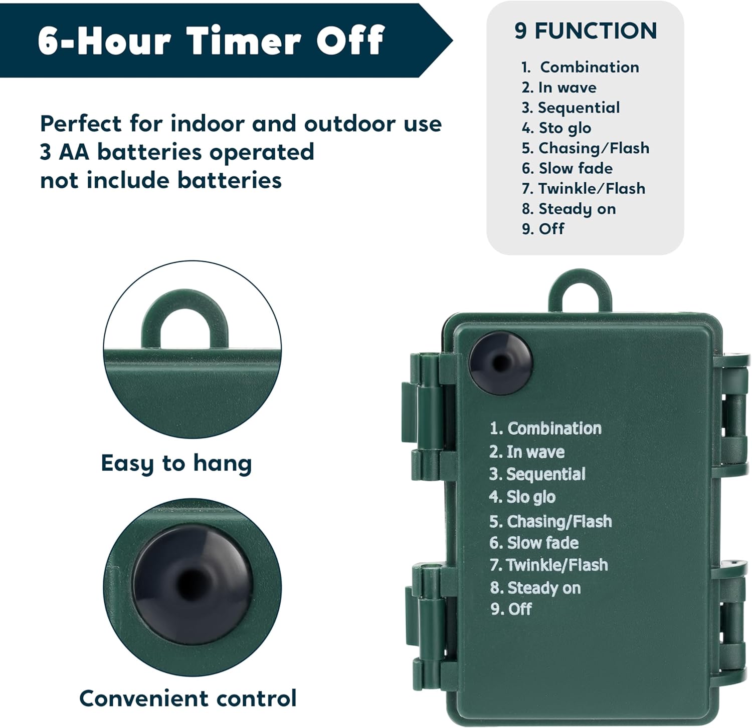 - BATTERY POWERED: This string light is powered by battery box (No timing function) using 3 AA batteries (Batteries Not Included). Just put it wherever you like without the limitation of socket