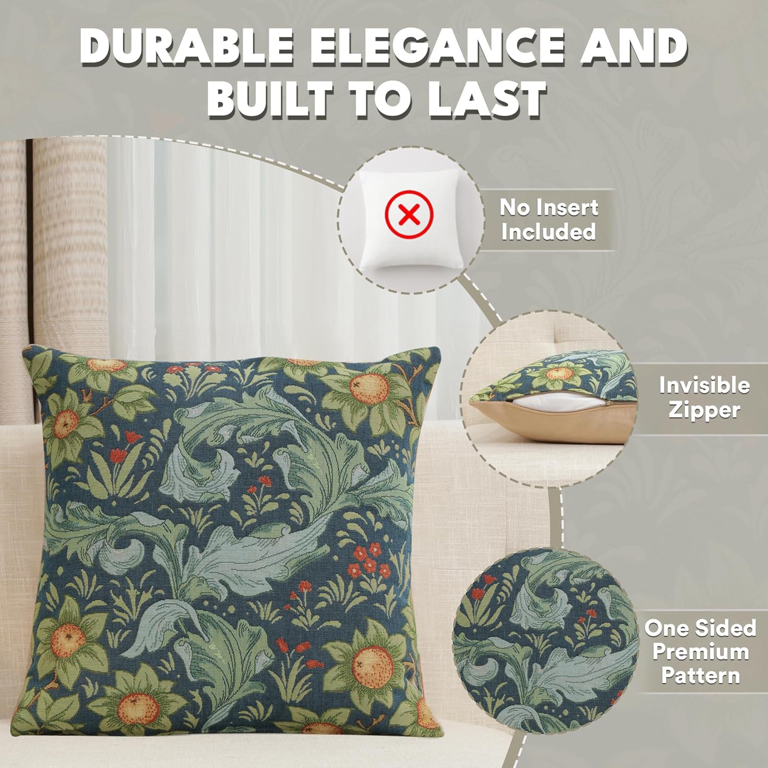 - Timeless Durability: Elevate your decor with our skin-friendly William Morris pillow covers 19”X19”, where quality and style come together. A sturdy hidden zipper ensures easy pillow insertion/removal, while the overlock stitches prevent seam ripping. Unlike thin printed cushion covers prone to tearing, our decorative pillows for couch with a super-soft backside are crafted with thick premium threads for long-lasting quality. THE PACKAGE INCLUDES A SINGLE TAPESTRY PILLOW COVER WITHOUT AN INSERT