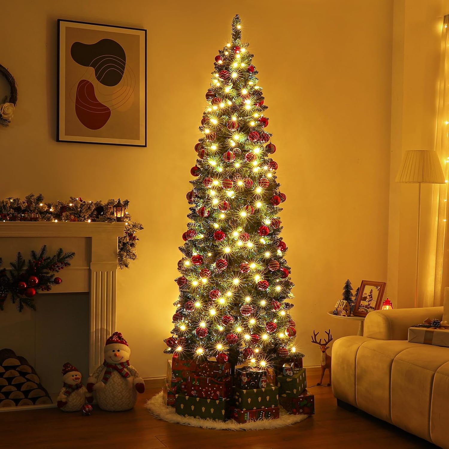 - PRE-DECORATED DESIGN: The pencil Christmas tree comes in a rich uniform color, with green leaves, Crafted with 590 branch tips, 160 lights, pine cones, and snow flocked leaves, the 6 ft Christmas tree is leafy and will give you an elegant look. This Flocked Christmas Tree OVERALL DIMENSIONS: 25"(Dia) x 71"(H)