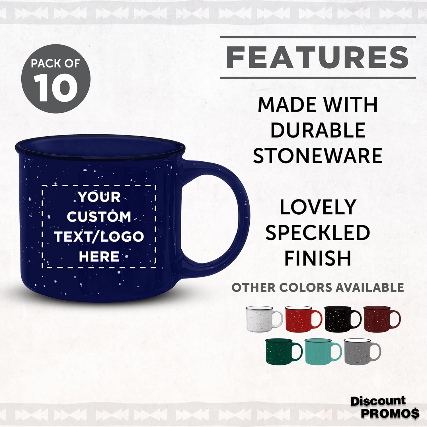 DISCOUNT PROMOS Custom Ceramic Campfire Coffee Mugs 13 oz. Set of 10, Personalized Bulk Pack - Perfect for Tea, Espresso, Cappuccino, Hot Cocoa - Blue