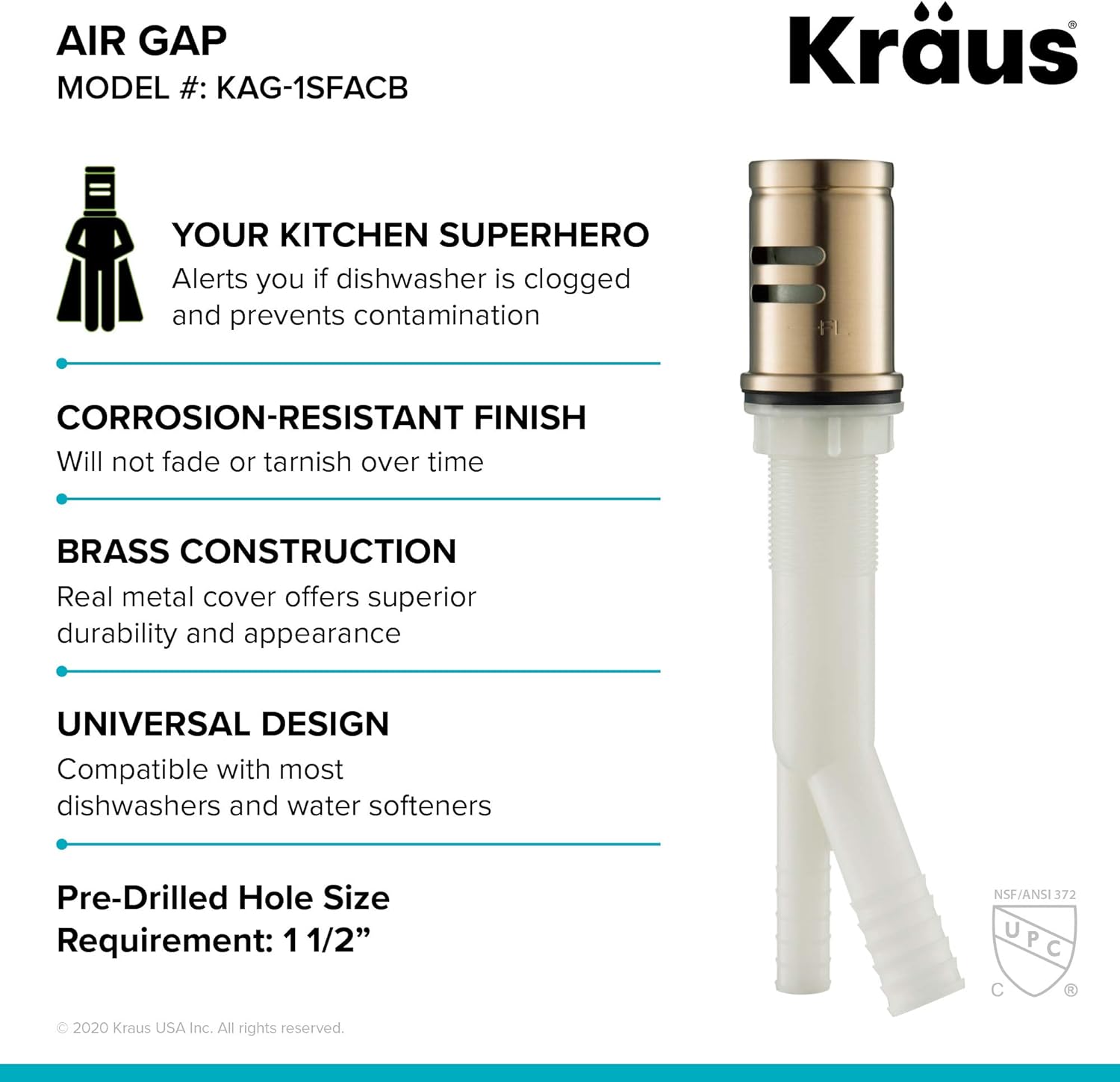 - AIR GAP KIT includes durable ABS plastic body and solid brass cover for a lifetime of reliable performance – SOLID BRASS COVER offers superior durability and a high-end appearance