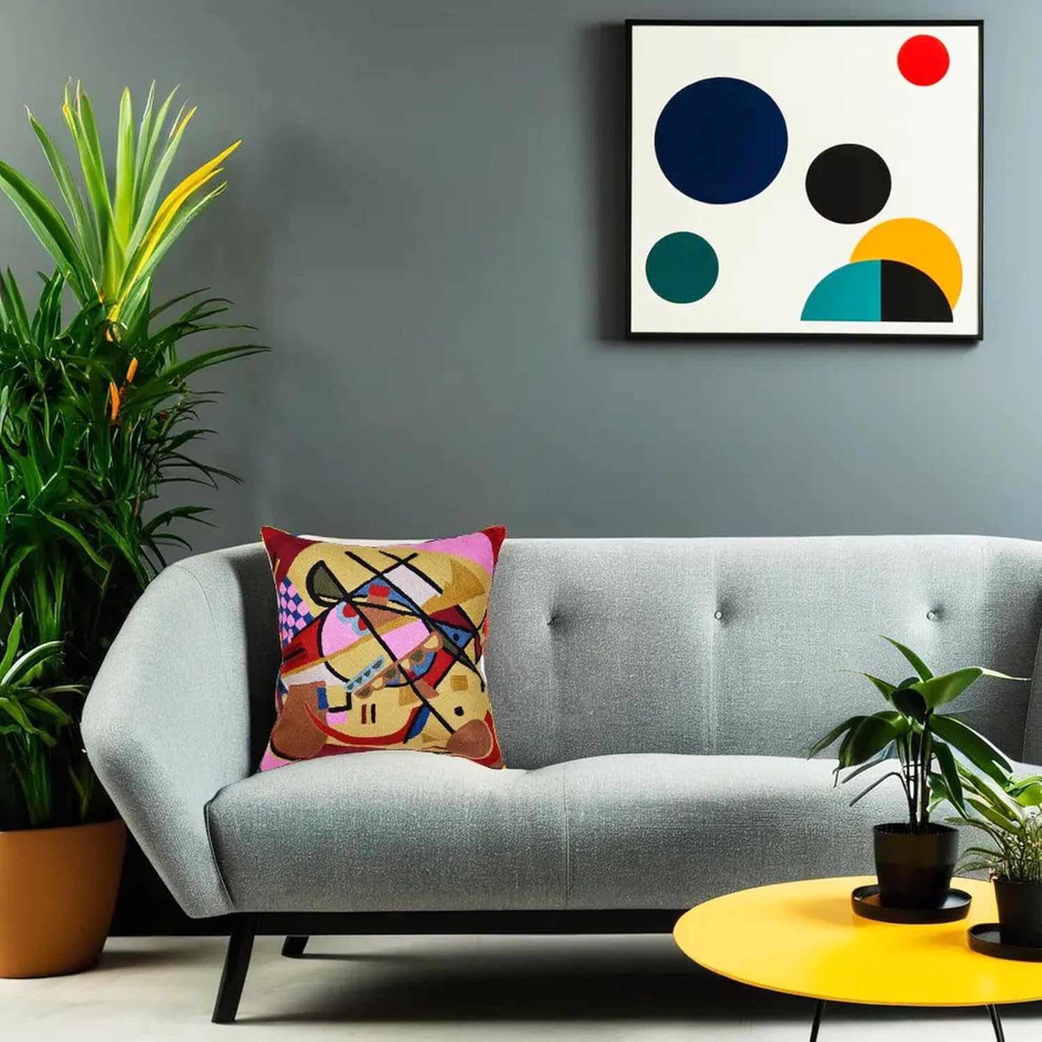 - 👍 MODERN THROW PILLOW COVER - HAND EMBROIDERED: These colorful decorative modern throw pillow covers are inspired by the art of Kandinsky and are hand embroidered in soft wool to perfection, stitch by stitch, by the finest artisans, creating an extraordinary all modern abstract pillow for your home decor. A close-up view of this all modern accent pillow cover allows you to see the amazing fine chain-stitch hand embroidery. A perfect modern sofa pillow for your contemporary couch.