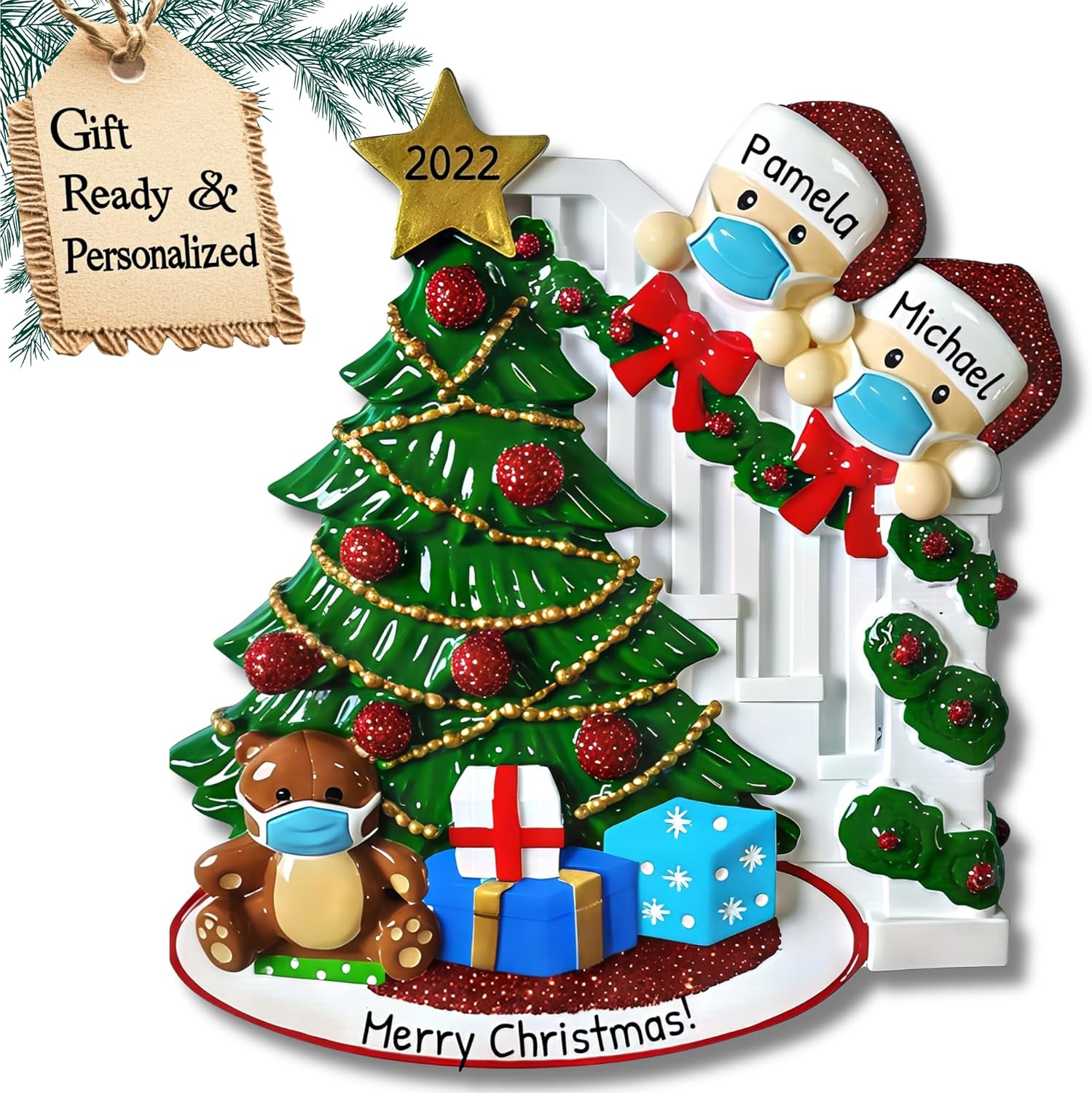 - 🎁 Celebrate Your First Holiday Together: This kids in Santa hats with masks ornament captures a cheerful scene with a Christmas tree with glitter red balls. It features a staircase garland and bow decoration and includes presents and masked teddy bear display, making it a perfect pandemic holiday keepsake 2026 design. Capture the magic of your love story with our first christmas ornament 2025. This personalized couple ornament is perfect for marking milestones—whether it's your first christmas together ornament or a meaningful holiday as a newly engaged couple starting new traditions.