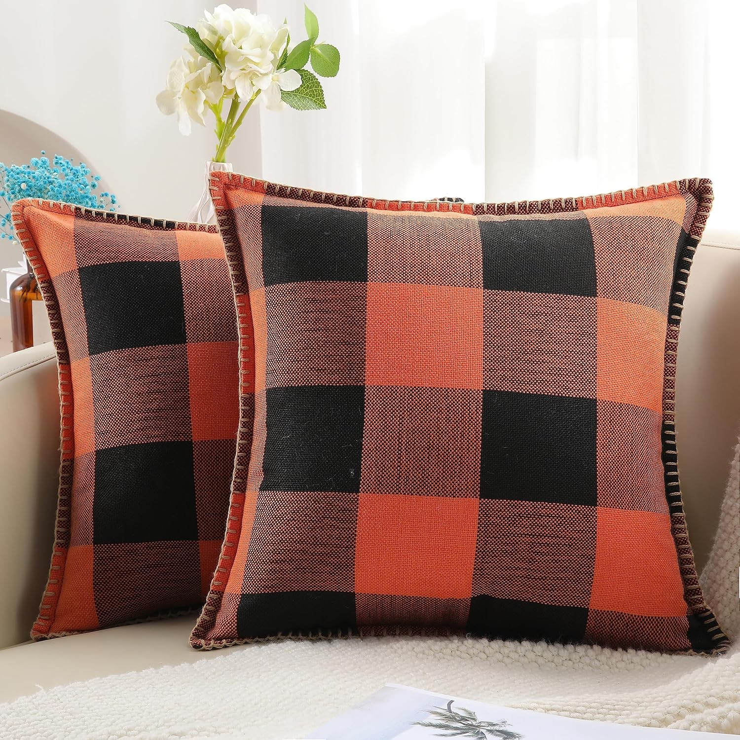 decorUhome Fall Orange and Black Decorative Throw Pillow Covers 22x22 Set of 2, Buffalo Plaid Check Farmhouse Cushion Covers with Stitched Edge for Autumn Harvest Couch Sofa Bed Home Decor