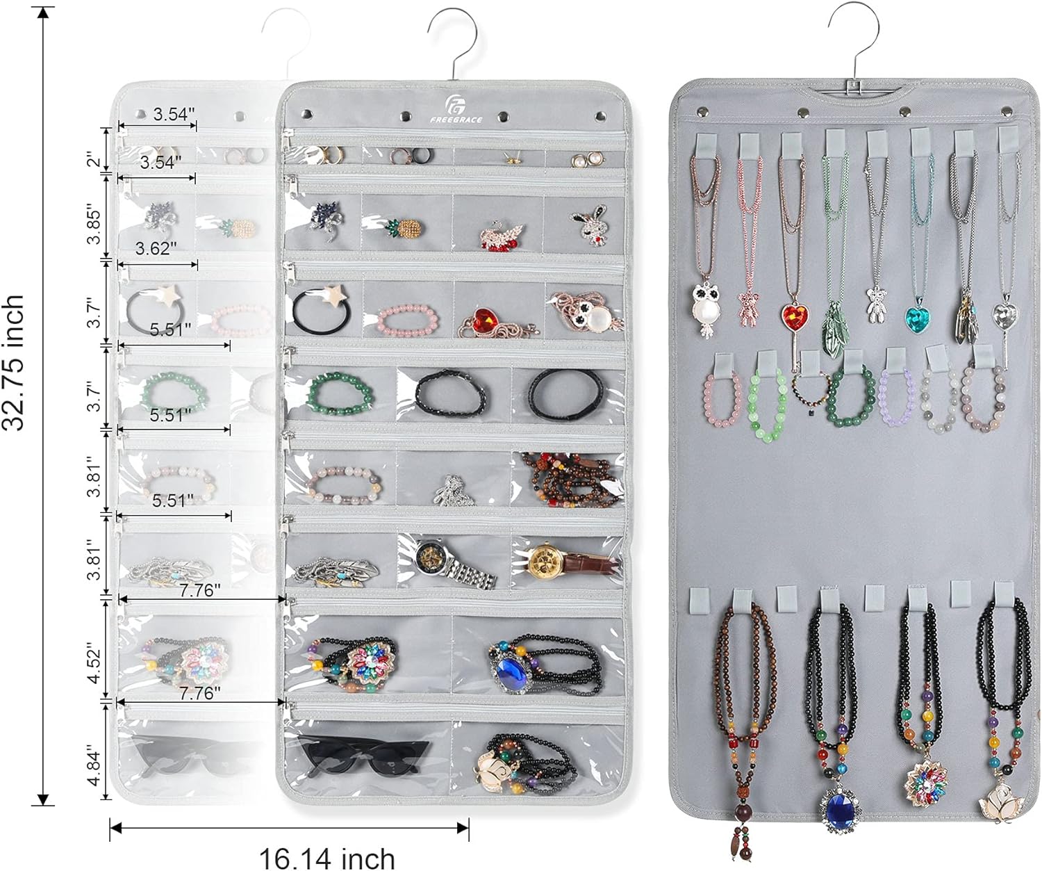 - QUALITY MATERIALS: Freegraceās sturdy hanging jewelry organizer is made of 600D polyester Oxford fabric and has a PU backing (SIZE: 32.7āā x 16.5āā). The pockets are made of transparent PVC to allow you to see through to the stored jewelry, and the zipper and revolving metal hanger are well-made and durable.