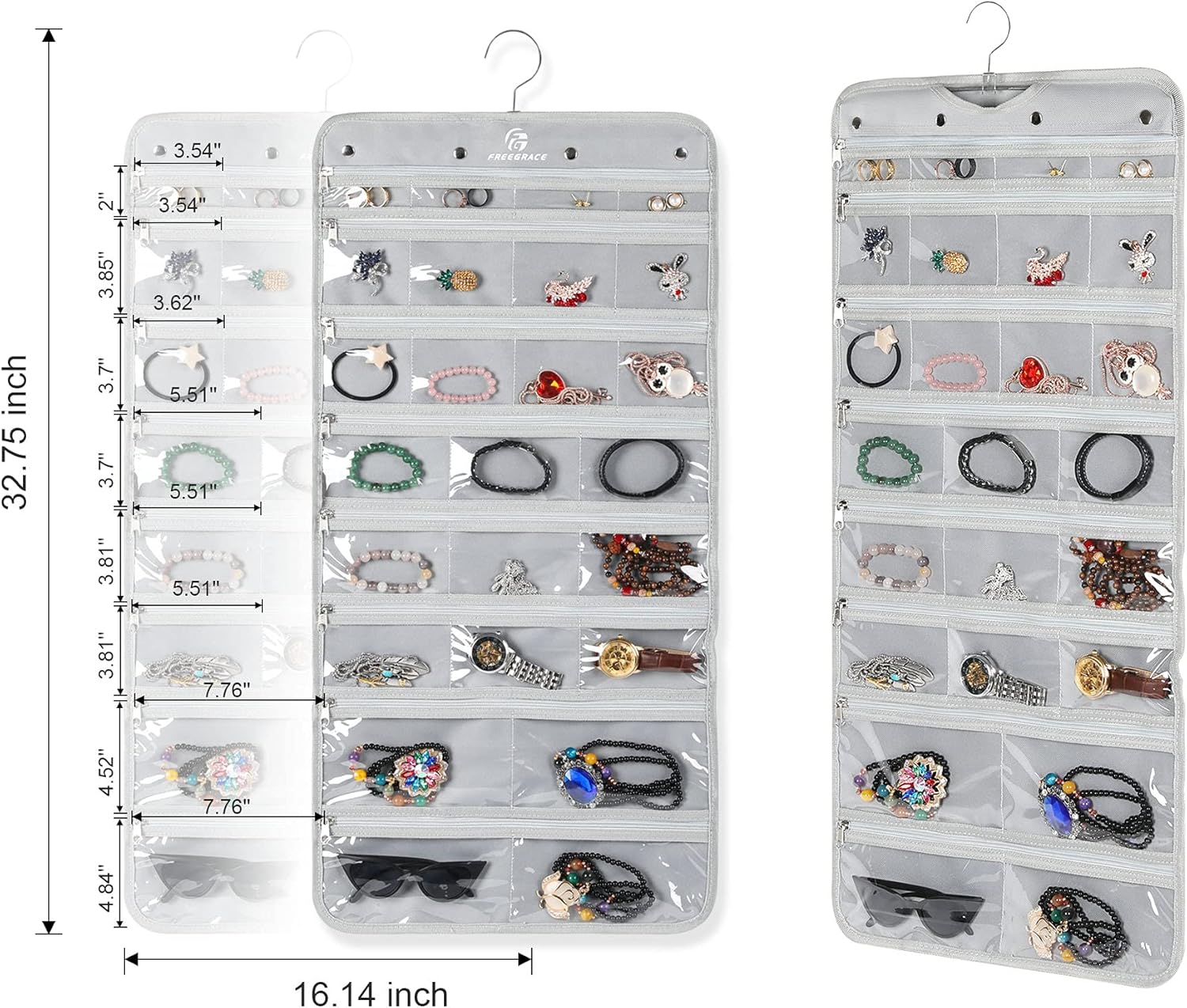 - QUALITY MATERIALS: Freegraceās sturdy hanging jewelry organizer is made of 600D polyester Oxford fabric and has a PU backing (SIZE: 32.7āā x 16.5āā). The pockets are made of transparent PVC to allow you to see through to the stored jewelry, and the zipper and revolving metal hanger are well-made and durable.