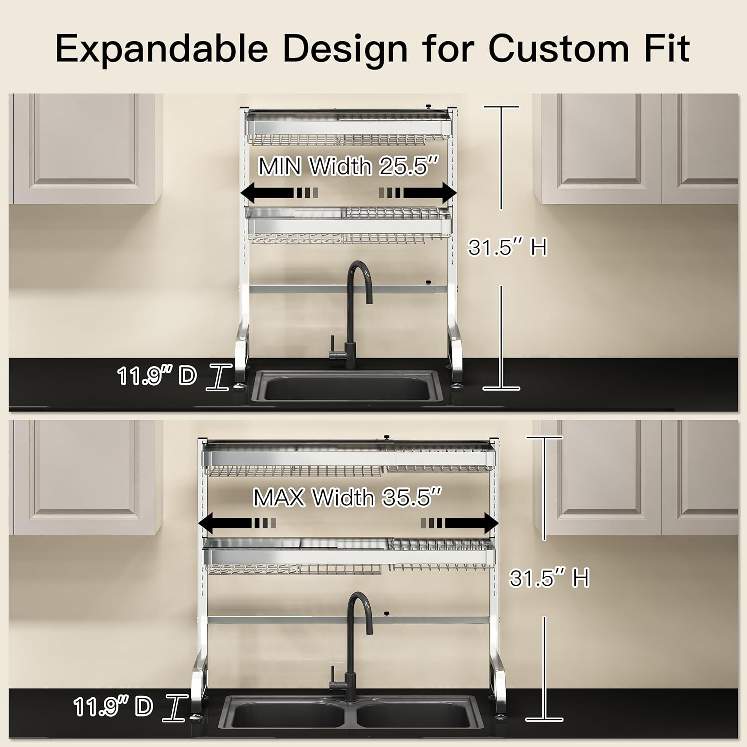 - š Expandable Design for Custom Fit: Adjust the over sink dish drying rack width effortlessly to span most standard single or double sinks, adapting seamlessly to your kitchen layout. The dish drain modular design allows rearranging tiers and accessories to prioritize space for tall glasses, wide pans, or cleaning tools, maximizing vertical storage above the sink