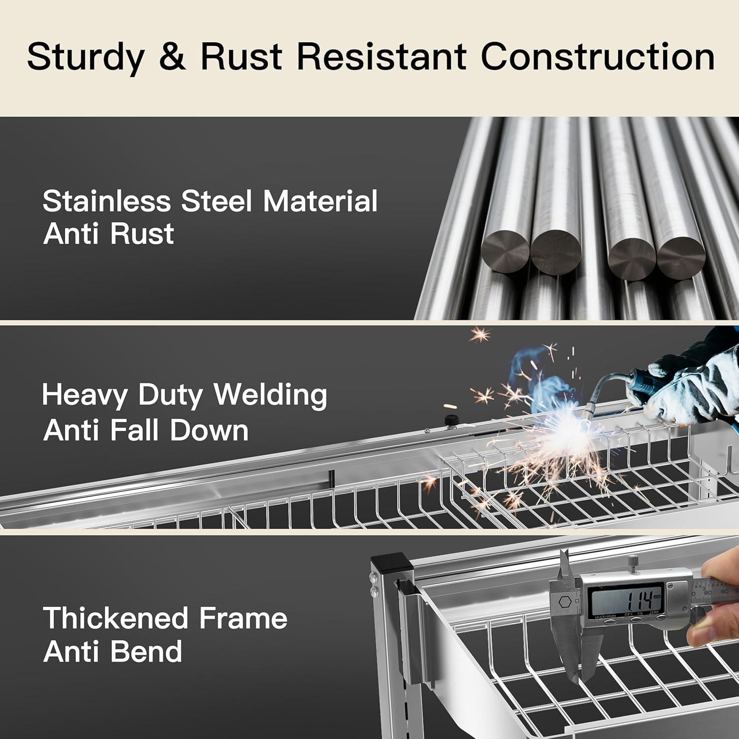 - š© Sturdy & Rust Resistant Construction: Crafted with heavy duty stainless steel and reinforced welding, this over the sink dish drainer drying rack resists corrosion and daily wear. Its industrial grade framework securely holds bulky pots, pans, and dishware without sagging, even when fully loaded, ideal for families seeking a lasting solution to countertop clutter