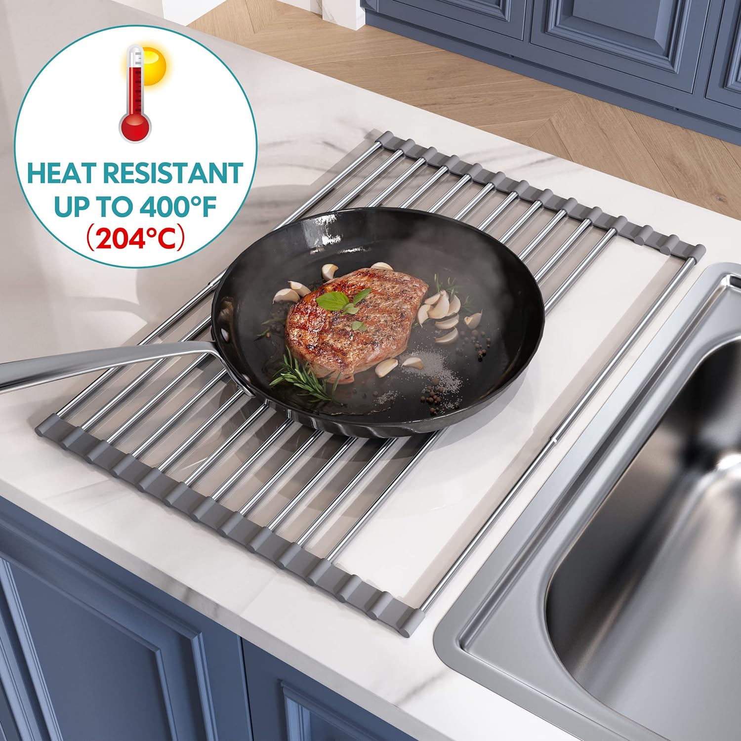 - Top Grade 304 Stainless Steel: Our foldable dish drying rack is made of 304 stainless steel, BPA-free food-safe silicone, which is sturdy, rust-resistant, corrosion-resistant, anti-slip, waterproof, high load bearing up to 70lbs, not easy to bend or twist by heavy cookware. Moreover, Heat resistant up to 400°F (204°C), dishwasher safe. What's more, the non-slip silicone on the edges holds it flat, even, and steady. Strong enough and large capacity to dry kitchen supplies.