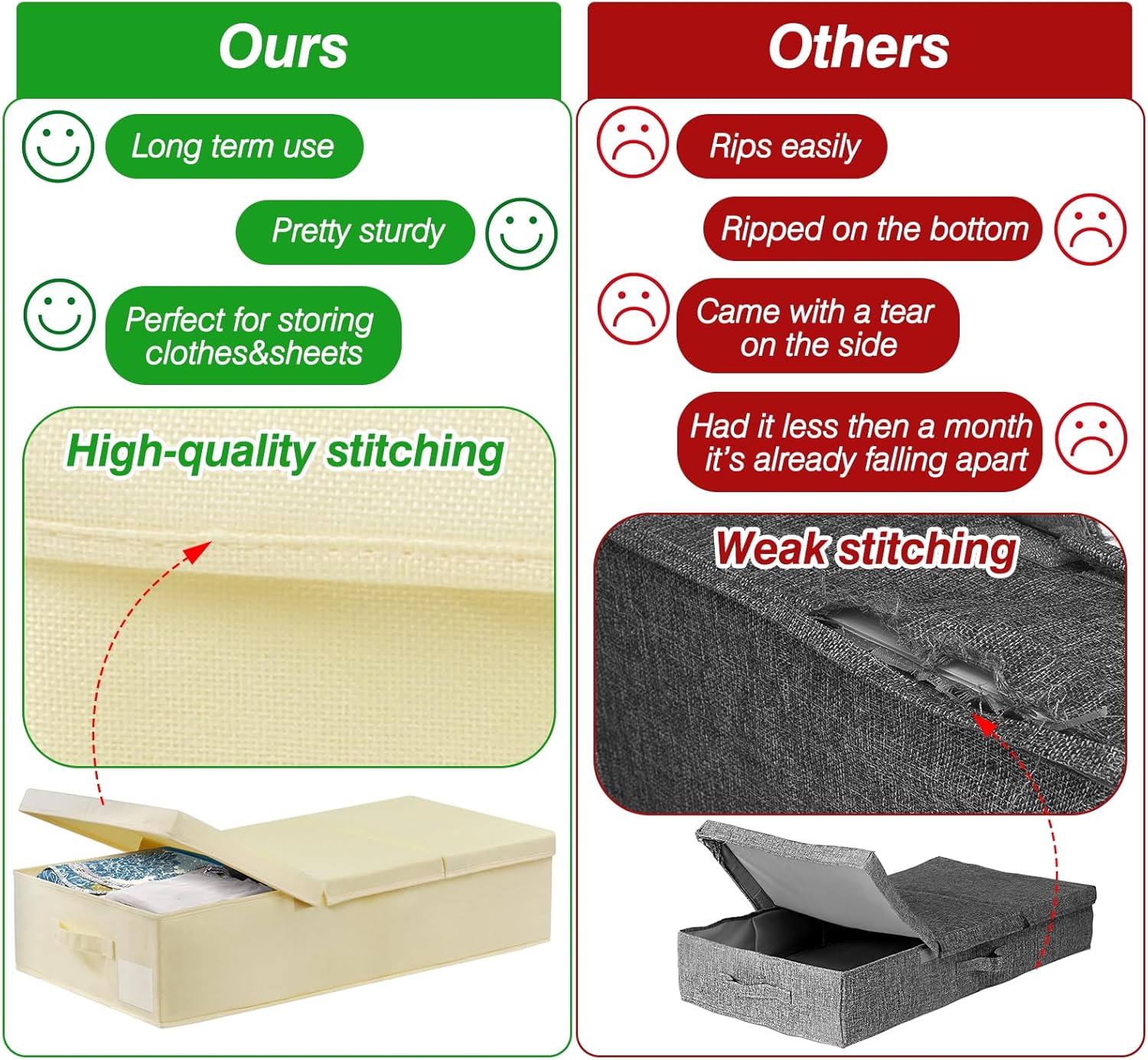 - STURDY STRUCTURE & STURDY HANDLES: 3 Reinforced sewn-in handles make it easy maneuverability and convenient for you to carry and pull out from under the bed; handy bins make excellent blanket organizers and storage; Lasts longer than underbed storage containers plastic; Keep your bedroom neat and tidy with storage bins with lids that fit your room's existing decor and theme