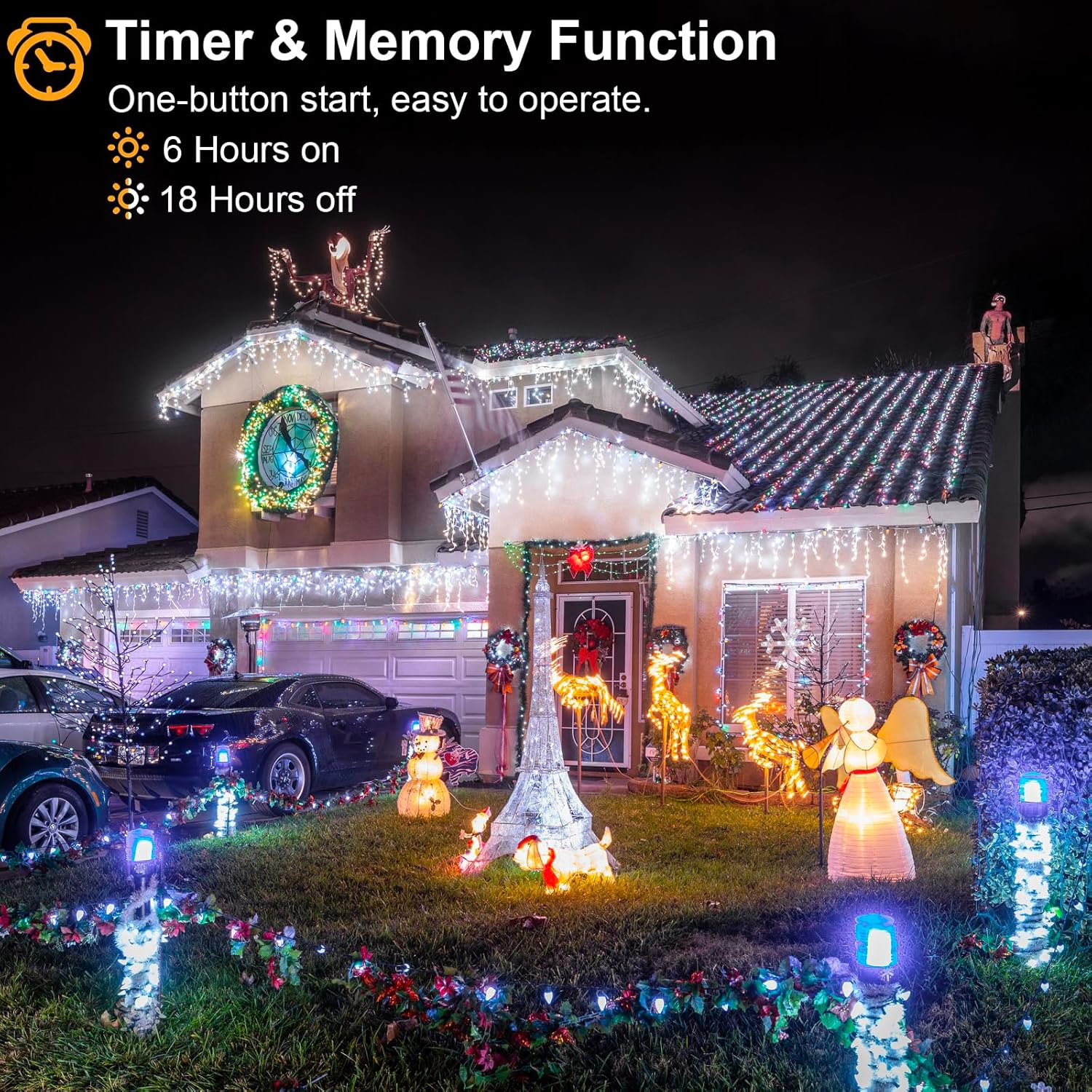 - [Timer&Memory Function] Long press the button on the plug 3 seconds until the green lights on, the LED icicle Christmas lights will be 6 hour on and 18 hour off automatically every day. Memory function design make the icicle lights will recover from the previous mode setting when you restart next time.