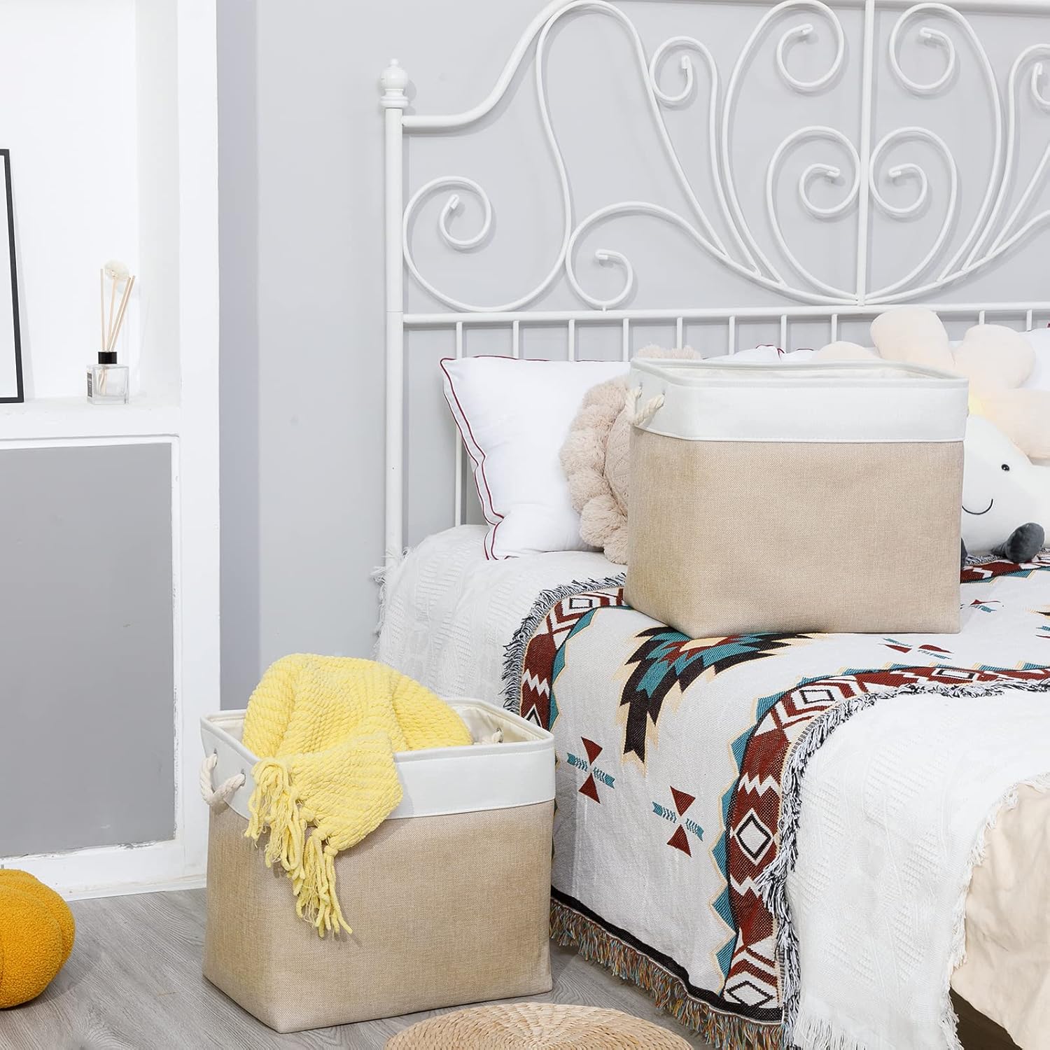 - [Multipurpose Storage] These large linen storage baskets for organizing provide an efficient solution in your home, office or travel to meet many storage needs such as organizing clothes, towels, blankets, toys, baby products, pet products, magazines, newspapers, camping tools, etc. Its storage capacity can keep the family tidy and beautiful, shelf baskets for organizing closet are a wonderful choice