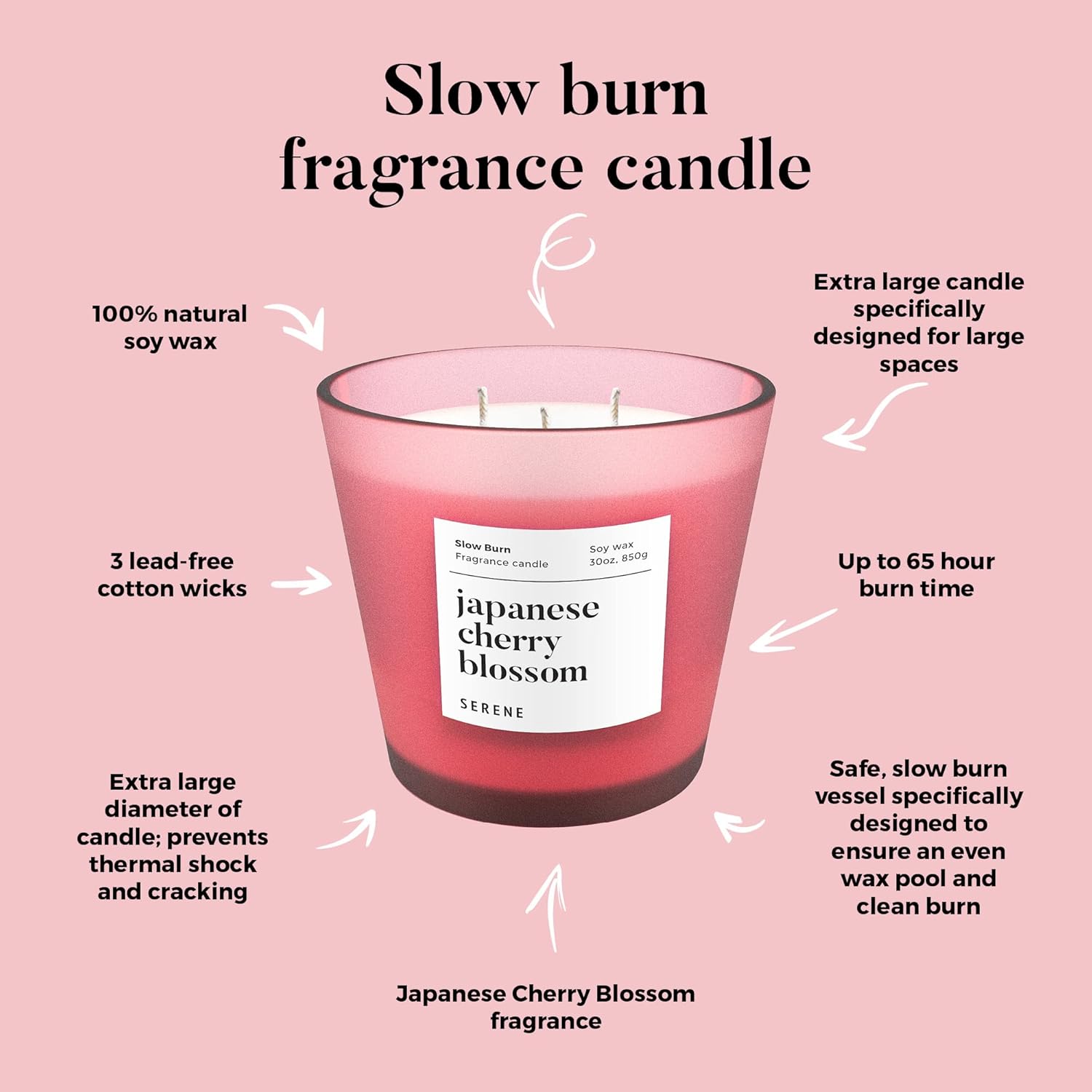 Hidden Label Large Scented Candle, Japanese Cherry Blossom, 30oz 3 Wick Huge Candle, Serene Collection Slow Burn Natural Soy Candles for Home Scented