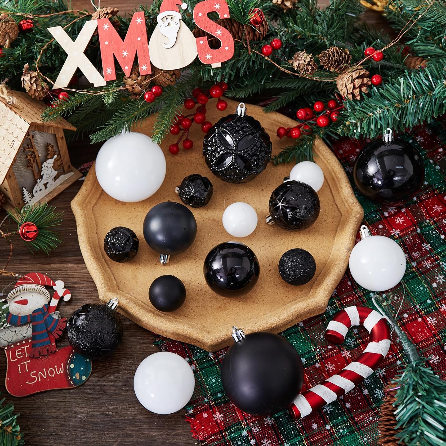 87-Pack Shatterproof Christmas Ball Ornaments Set, Christmas Tree Decorations with Hand-held Gift Package for Xmas Tree Holiday Wedding Party (Black and White)