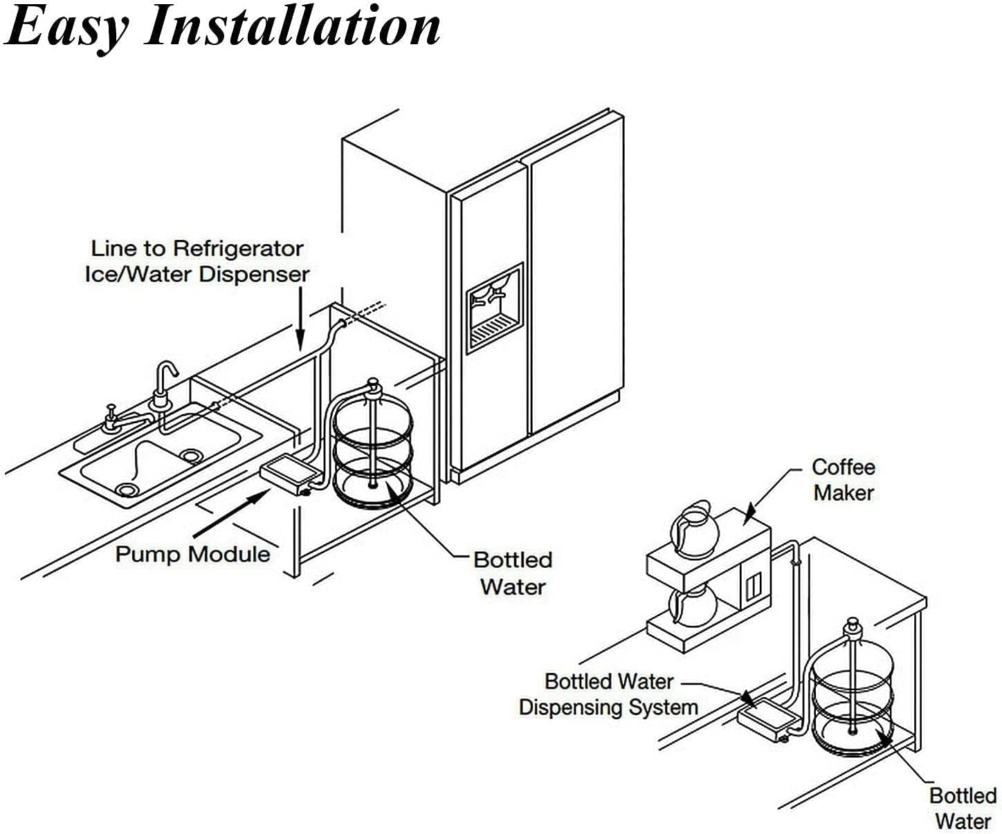 - WATER PUMP DISPENSER SYSTEM: This 110V bottle water pump system can provide power to a commercial 5 gallon jug of water. It delivers water under pressure to individual drinking water taps, providing hot or cold water anytime. Compatible use for refrigerators, coffee makers, tea makers and faucets etc.(this product is not including a faucet)
