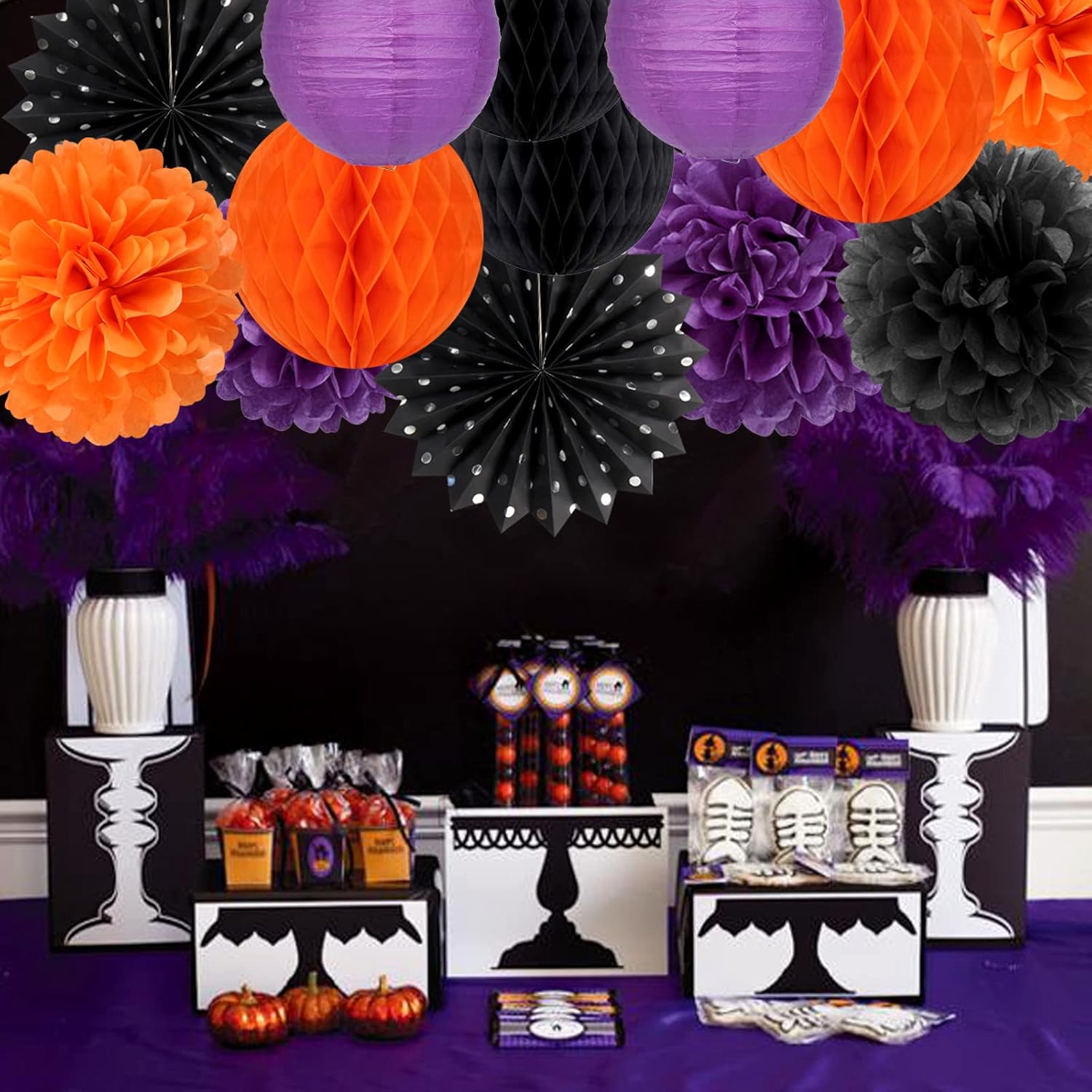 - 【Black Orange Purple Halloween Party Kits】The party decorations kits include 6pcs tissue paper flowers: 3pcs 10" and 3pcs 12" in three color, 4pcs 8inch paper honeycom ball,2pcs 8inch paper lantern, 2pcs 12inch paper fan.