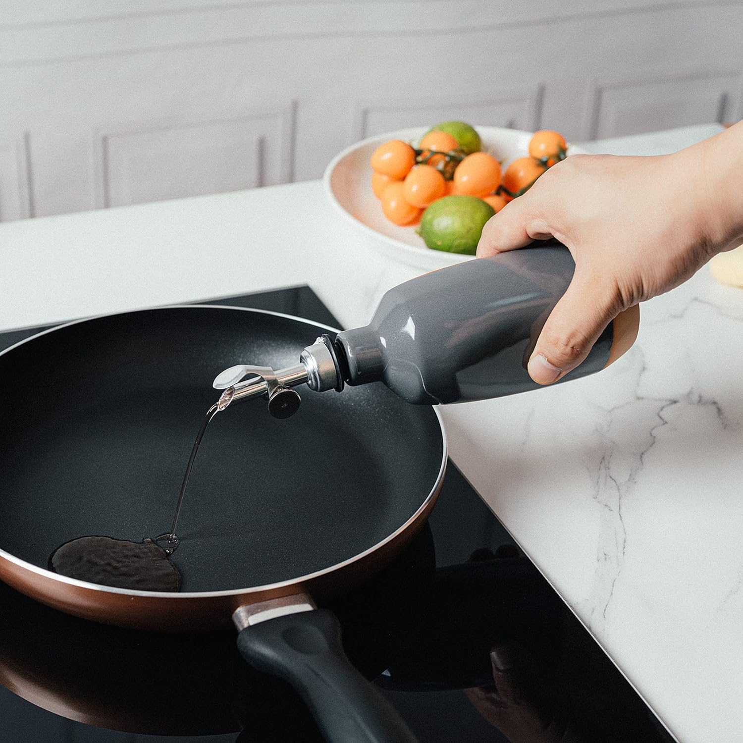 - Dazzle your friends and family and take your drizzles to the next level with this Dark Grey Cruet by Gute. The cruet features a bold motif, a subtly asymmetrical, grey playfully askew that is not only practical but perfect for entertaining inside and outside! With its classic round shape, the vessel is not only extremely elegant and simple to put in center of your dinner table, but also keeps oil and vinegar in the front of your mind. An excellent gift for any occasion to remember!