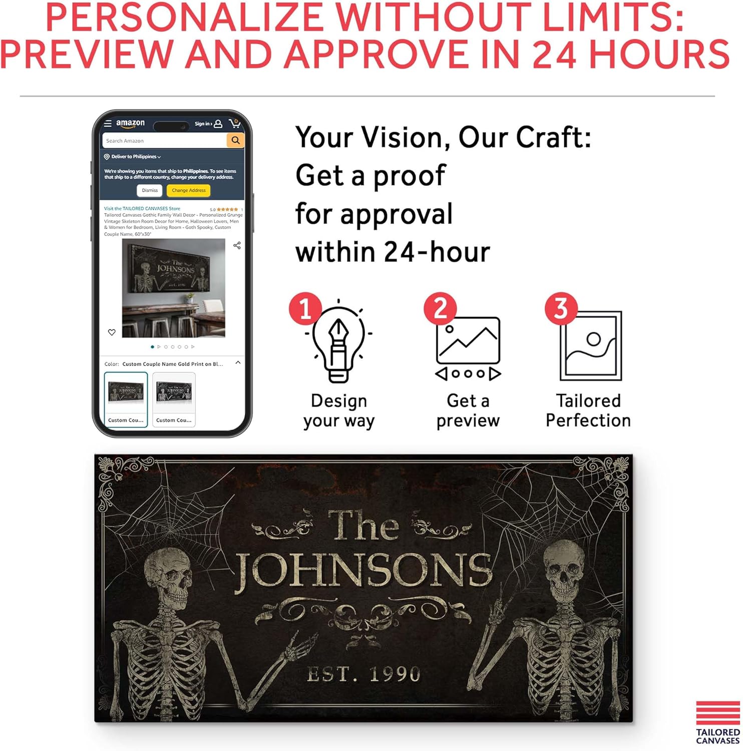 Tailored Canvases Gothic Family Wall Decor - Personalized Grunge Vintage Skeleton Room Decor for Home, Halloween Lovers, Men & Women for Bedroom, Living Room - Goth Spooky, Custom Couple Name, 48"x24"
