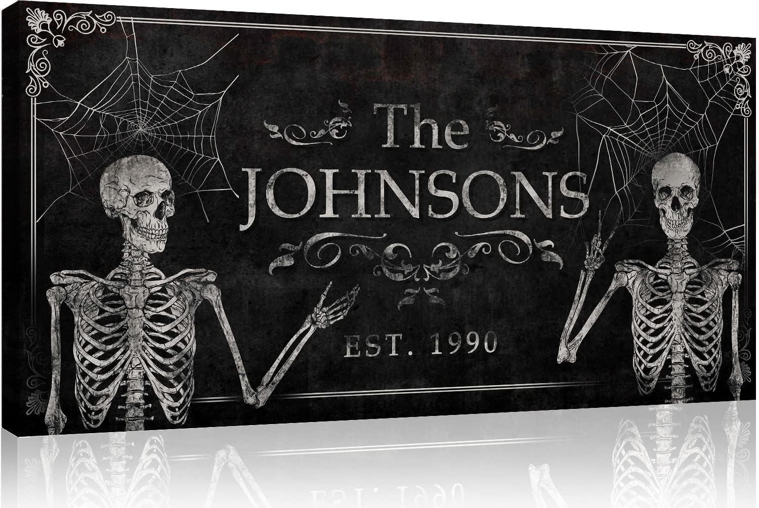 Tailored Canvases Gothic Family Wall Decor - Personalized Grunge Vintage Skeleton Room Decor for Home, Halloween Lovers, Men & Women for Bedroom, Living Room - Custom Couple Name, White Print, 48"x24"