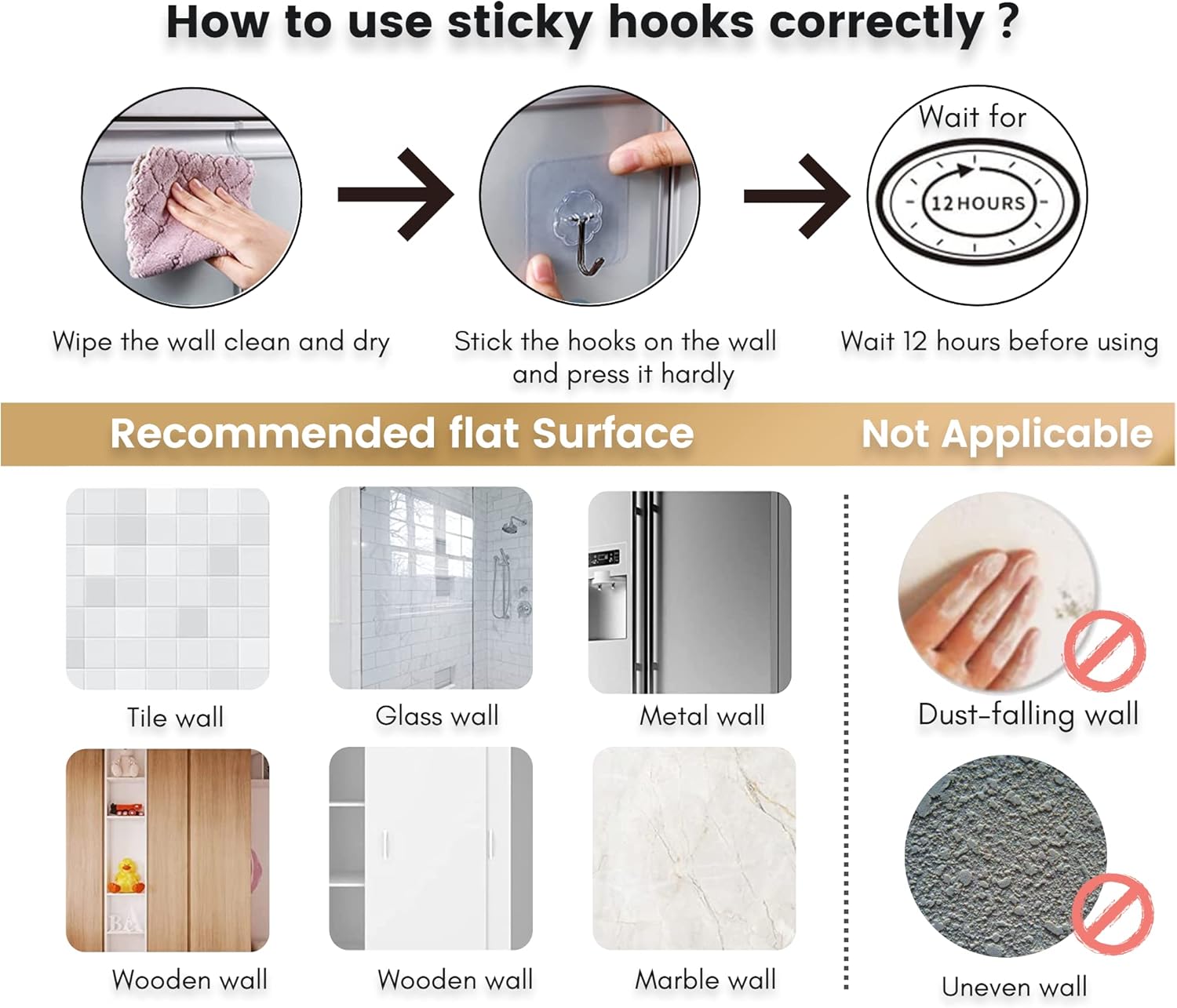 - ćHow to Useć1) Stick the hook on any smooth clean dry surface and press it tightly to remove any bubbles. 2) Wait 12 hours to adhere the hook firmly. 3) Finally, you can hang the hanging bag on the hook to enjoy it.