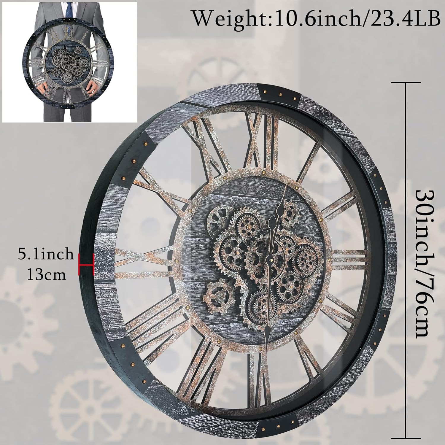 30 Inch Industrial Steampunk Wall Clock, Gray, Battery Operated, Real Rotating Gears, Solid Wood Frame, Oversized Wall Clock for Living Room Decor