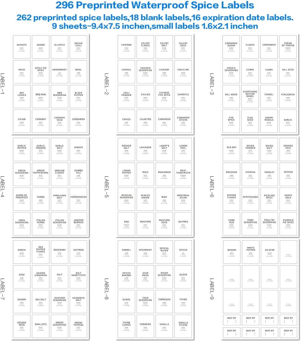 - 【BLACK AND WHITE WATERPROOF SPICE JAR LABELS】Our bamboo lid spice jars labels of black and white color. Include 262 preprinted spice labels, 18 blank labels, 16 expiration date labels.