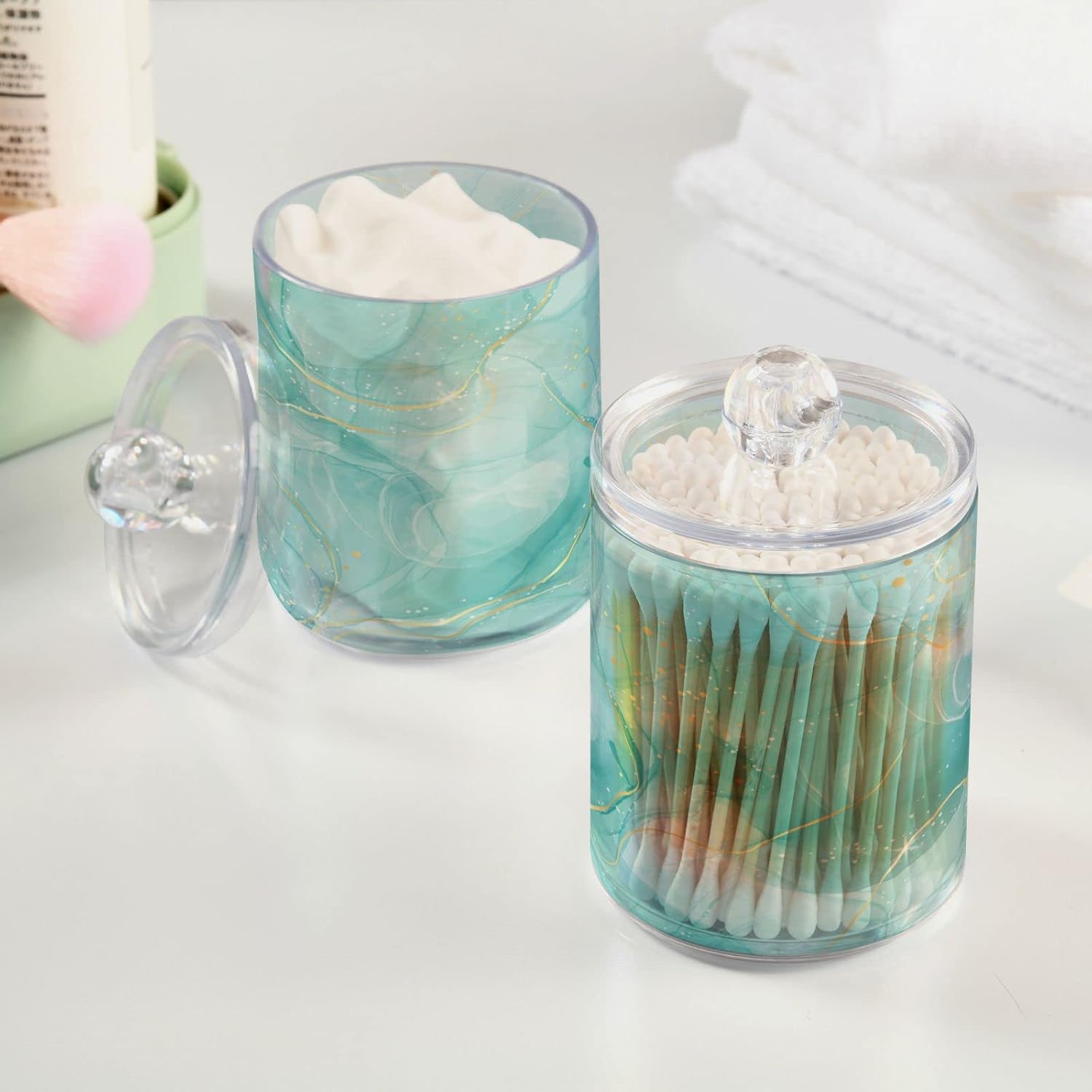 2 Pack Qtip Holder Dispenser Turquoise Marble Bathroom Storage Canister Lid Acrylic Plastic Apothecary Jar Set Vanity Makeup Organizer for Cotton Swabs/Pads/Floss