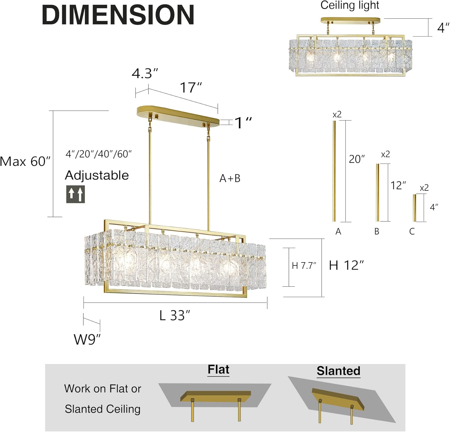 - [ MEDIUM SIZE ]: The dimension of this unique crystal chandelier is L33 x W9 x H12. The hanging height is from 4"-60" adjustable. The US standard canopy size: L17" x W4.3" x H1.0". The total weight is 25LB. And it is perfect for large dining room, kitchen island, living room, bar table etc.