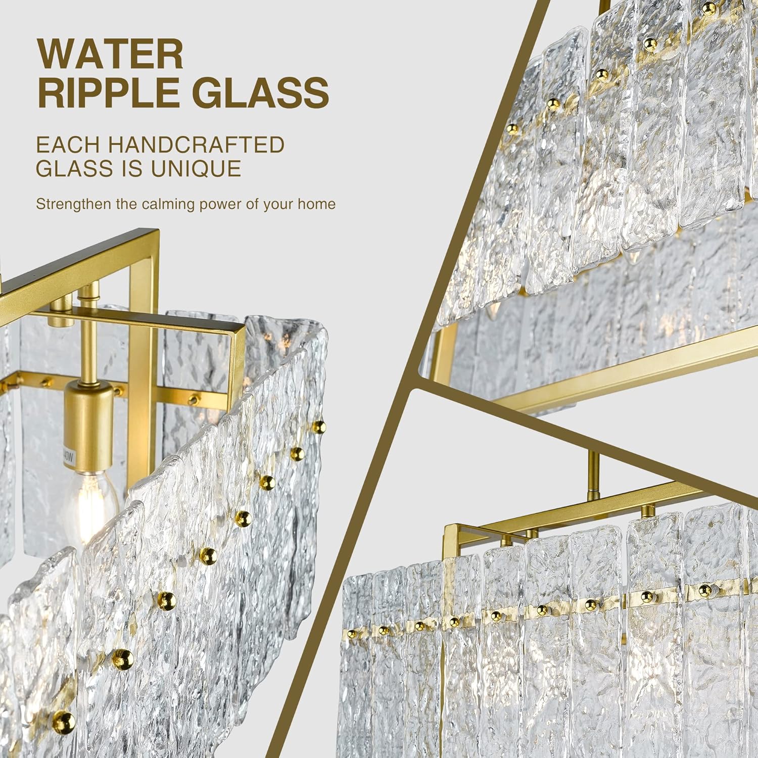 IKK Modern Gold Rectangle Chandeliers for Dining Room, Crystal Water Ripple Light Fixture, Elegant Farmhouse Linear Lighting for Kitchen Island, Bar Table, L33 x W9 x H12