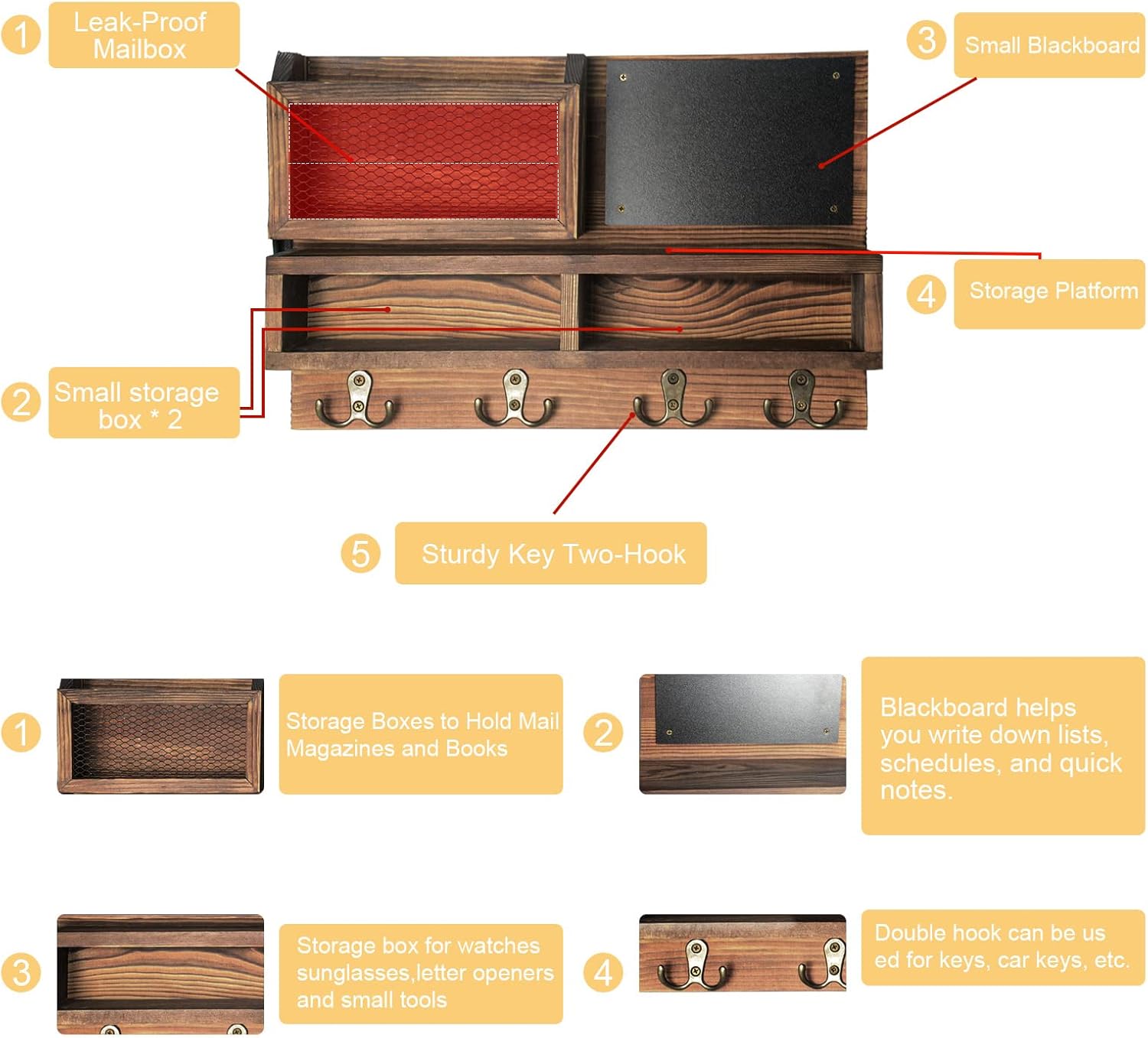 - 🏡 Multiple Storage Shelves ► This organizer wall-mounted key holder integrates 4 double-sided key hooks, mail organizer, chalkboard sticky note and 2 storage box. You can use the hanging organizer to hold keys, mail, wallets, sunglasses, hats, umbrellas, and more. This way you won't lose your keys and mail in the chaos as a result.