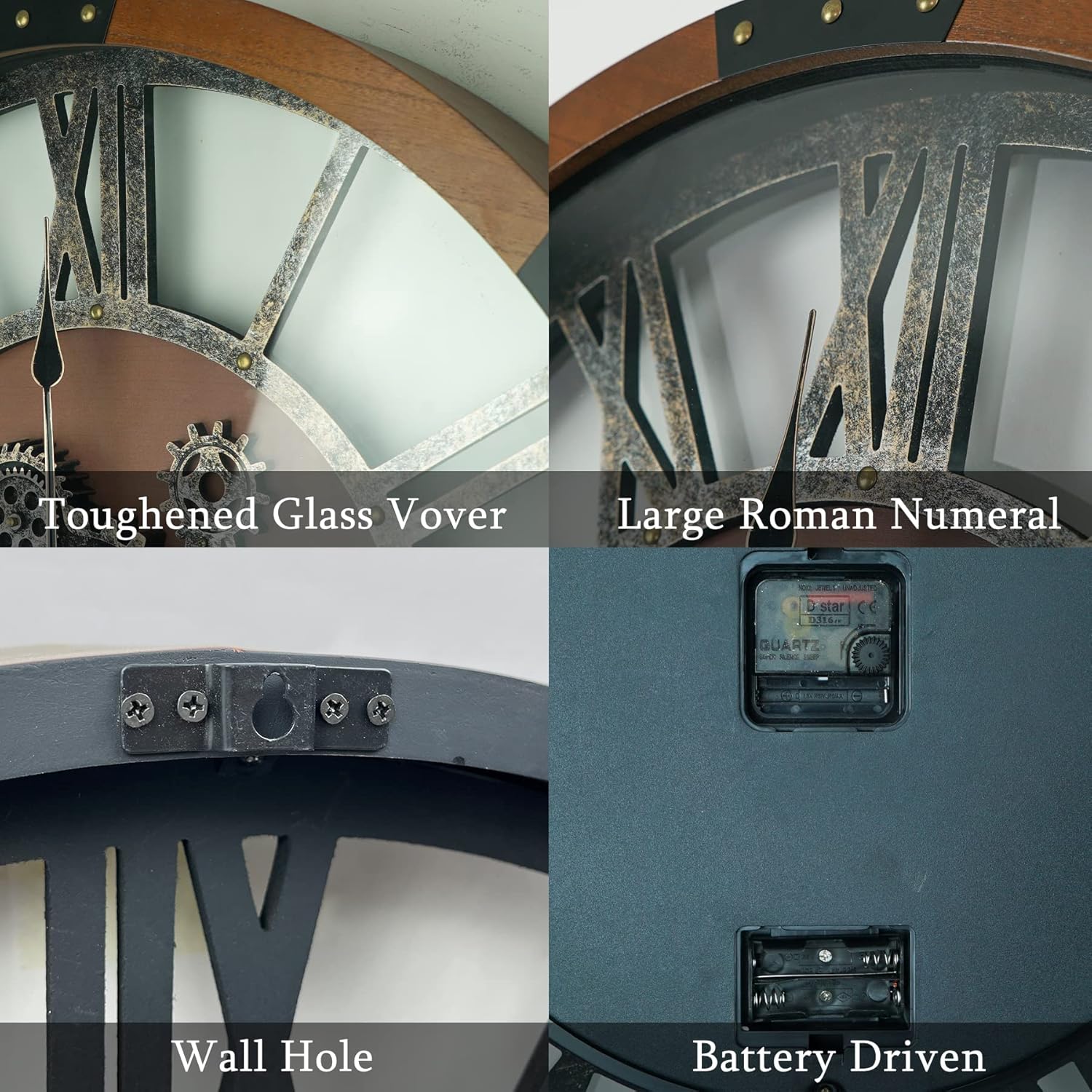 - šReal Rotating Gears: The exposed gears on this large wall clock are real and rotate independently of the pointers. With a dust proof glass cover and battery powered operation, the gears rotate almost silently, providing a unique and dynamic way to experience time.