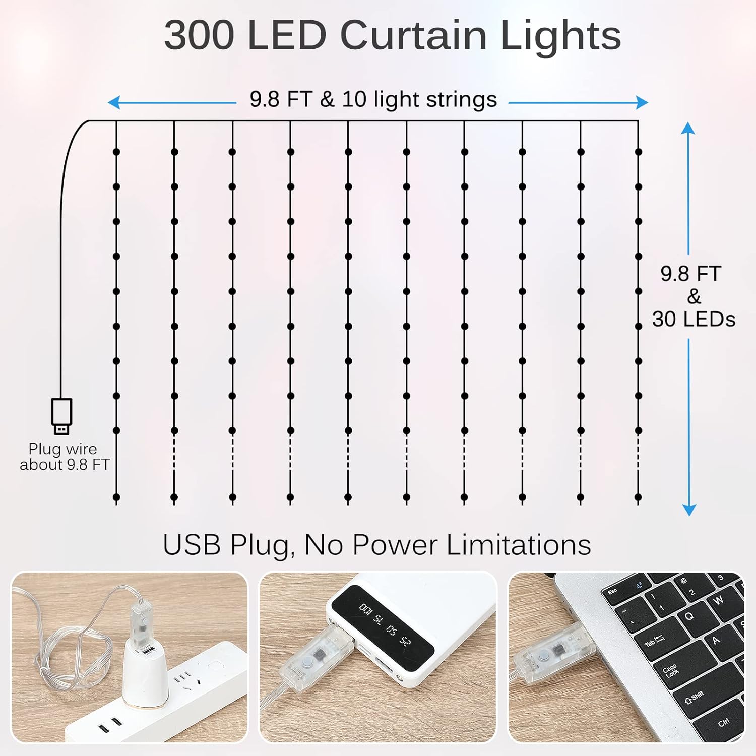 - LED Curtain Lights: With 300 LED lights covering 9.8ft * 9.8ft, KepStars beautiful fairy curtain lights are perfect for creating an enchanting backdrop for bedroom, kitchen, stair, dining room, living room area, not just for indoor use, they're also ideal for creating an outdoor wonderland.