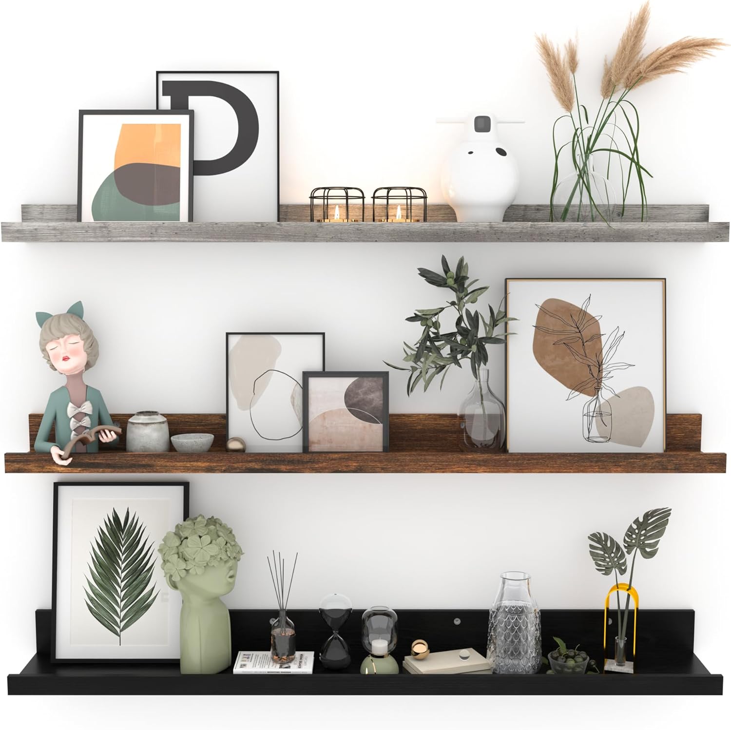 - Colorful wooden shelves Set: 3 colors included: black, brown, and grey. The 3 mixed colors wall-mounted shelves set blends perfectly into any space, not only as a wall storage tool, but also as a wall decoration.