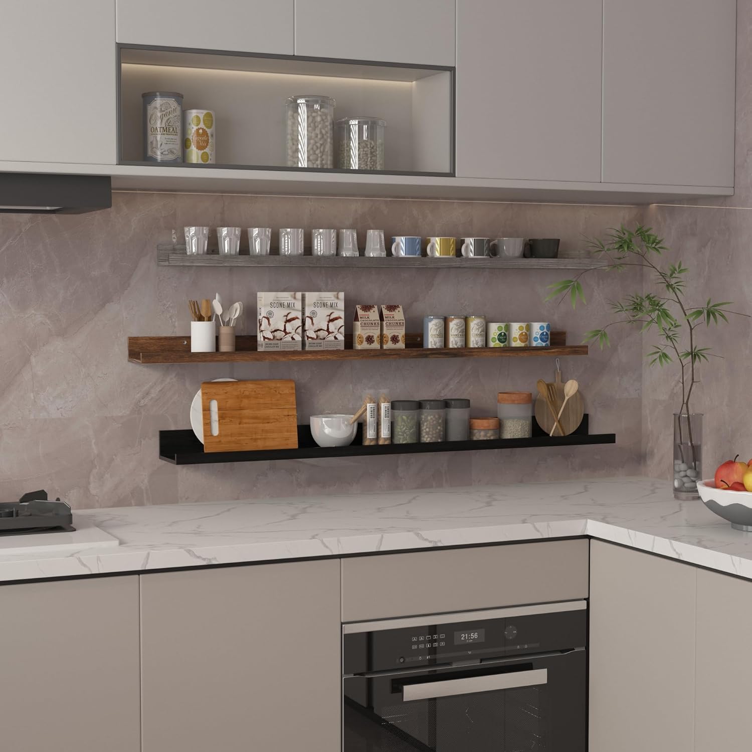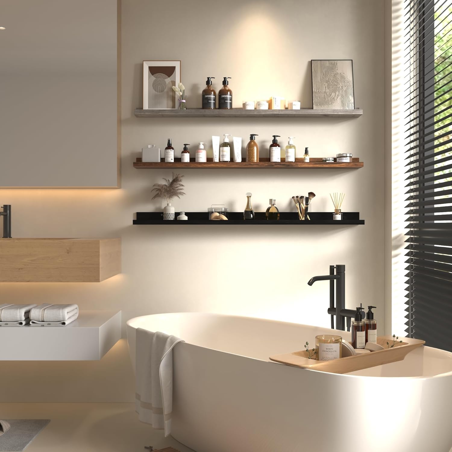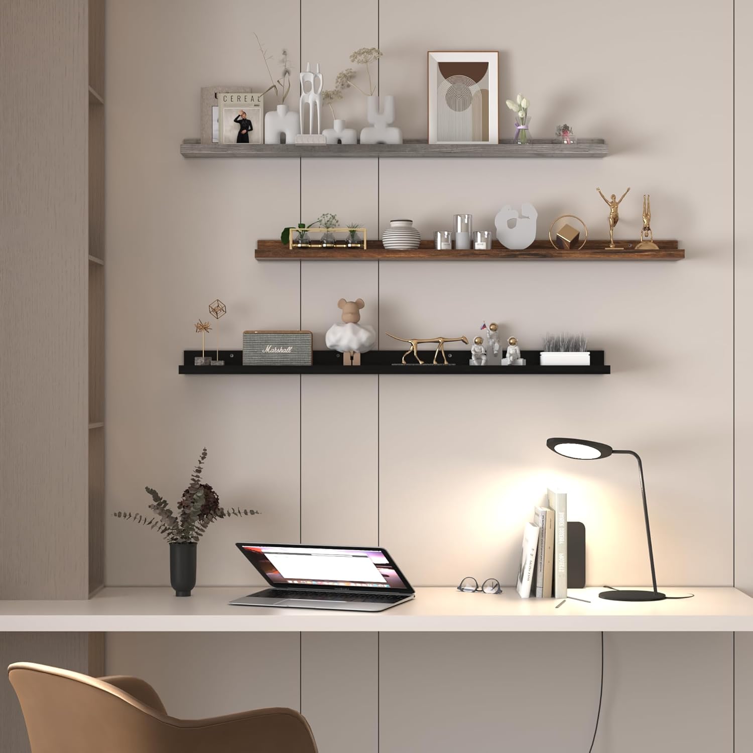 - Colorful wooden shelves Set: 3 colors included: black, brown, and grey. The 3 mixed colors wall-mounted shelves set blends perfectly into any space, not only as a wall storage tool, but also as a wall decoration.