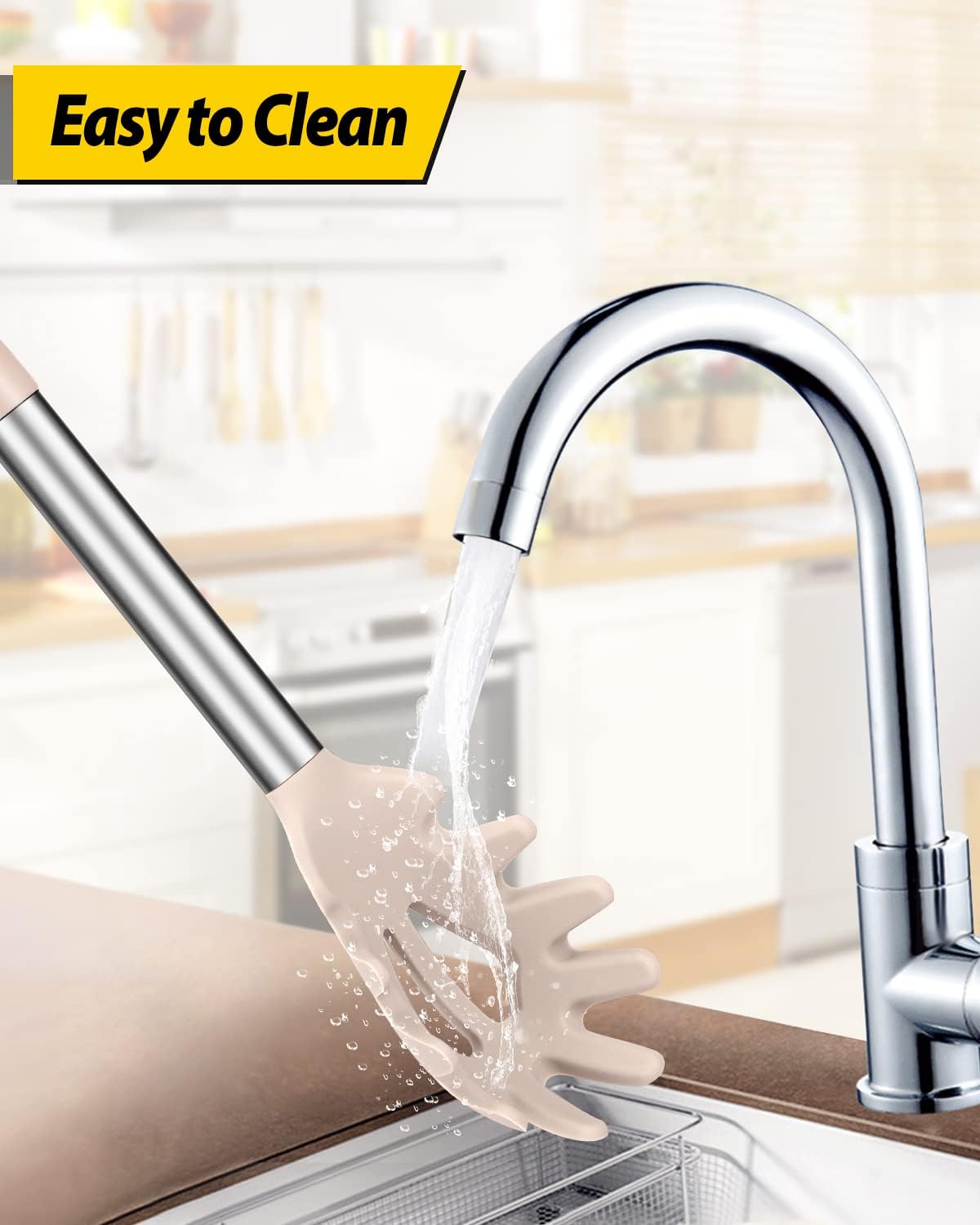 Silicone Pasta Fork and Ladle Spoon Set, Large Non Stick Kitchen Utensils for Cooking,Stirring,Serving Spaghetti, Soup, Sauce (KHAKI)